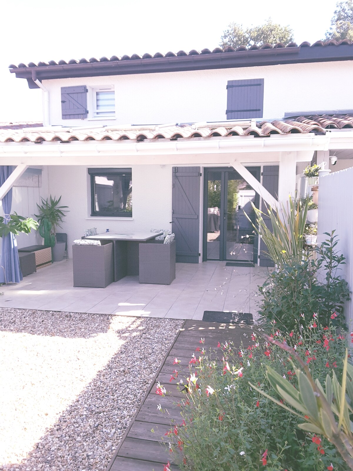 Grande maison de conception contemporaine, PARTAGEE EN DEUX PARTIES, Une occupée par Daniel & Simone et une partie attenante 90 M² est louée sur Airbnb Nous sommes deux, Daniel & Simone, retraités dynamiques et discrets. Les deux parties sont bien séparées par un local technique/buanderie. La partie louée est entièrement indépendante, entrée/parking dédiée et invisible à notre vue et une partie terrasse réservée avec brise vue. Nous partageons seulement la piscine et le jardin clôturé.