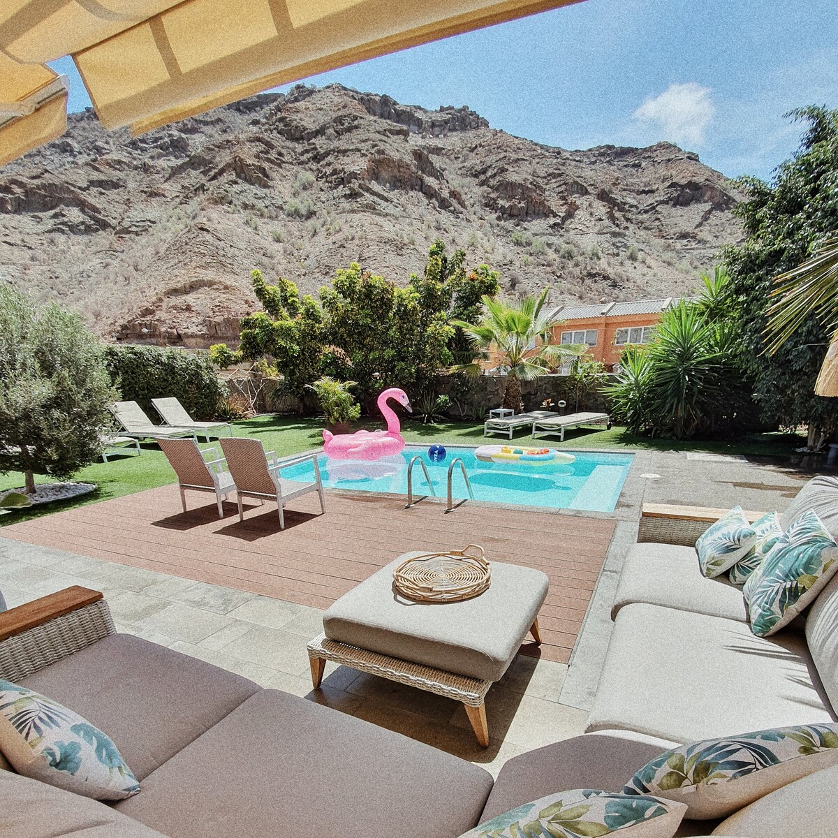 有名なアマドレスビーチやアンフィゴルフに近い、日当たりの良いエリアにある素敵で高品質のヴィラ! ヴィラは高い基準に基づいて設計されており、設備の整ったキッチン、ラウンジ2室、寝室4室、バスルーム4室、広々とした中庭テラス、バーベキューエリア、植物園/温水プールが備わっています。 快適さを重視したプライベートな場所です。 家族向けで、子どもたちはプールエリアが大好きです。 最高のビーチ、グラン・カナリアで最も新しいモールから5分です。