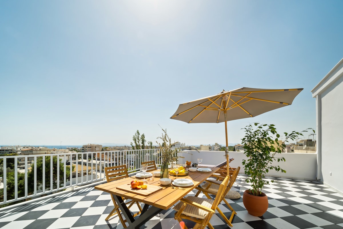 Fully renovated apartment in Alimos, Athens, Greece. A stunning, cosy, rooftop apartment, with a vast private terrace, offering instaworthy views of the Athenian Riviera. Interiors tastefully and minimally designed, speck clean, fully and luxuriously equipped for short or long stays, winter or summer. Enjoy your holiday, easily blending moments by the beach (2 min walk) and the Athens Center with its great history and atmosphere.