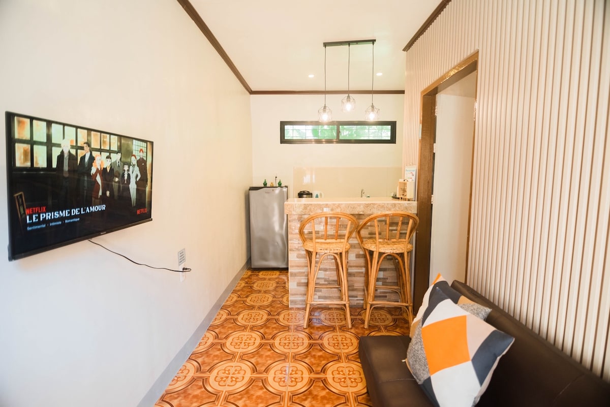 INCLUSIONS: • Private balcony with a small garden area • Air-conditioned bedroom with comfortable linens • Private toilet & bath with shower • Spacious living area with Netflix-ready TV • High-speed WiFi (PLDT Fibr – 250 Mbps) • Access to a fully equipped shared kitchen • Refrigerator, cooking utensils, and dining bar counter • Fresh towels and basic toiletries provided Guest Access Additional Services (Upon Request) • Airport transfer • Van transfers around Palawan • Tour packages/ Rentals