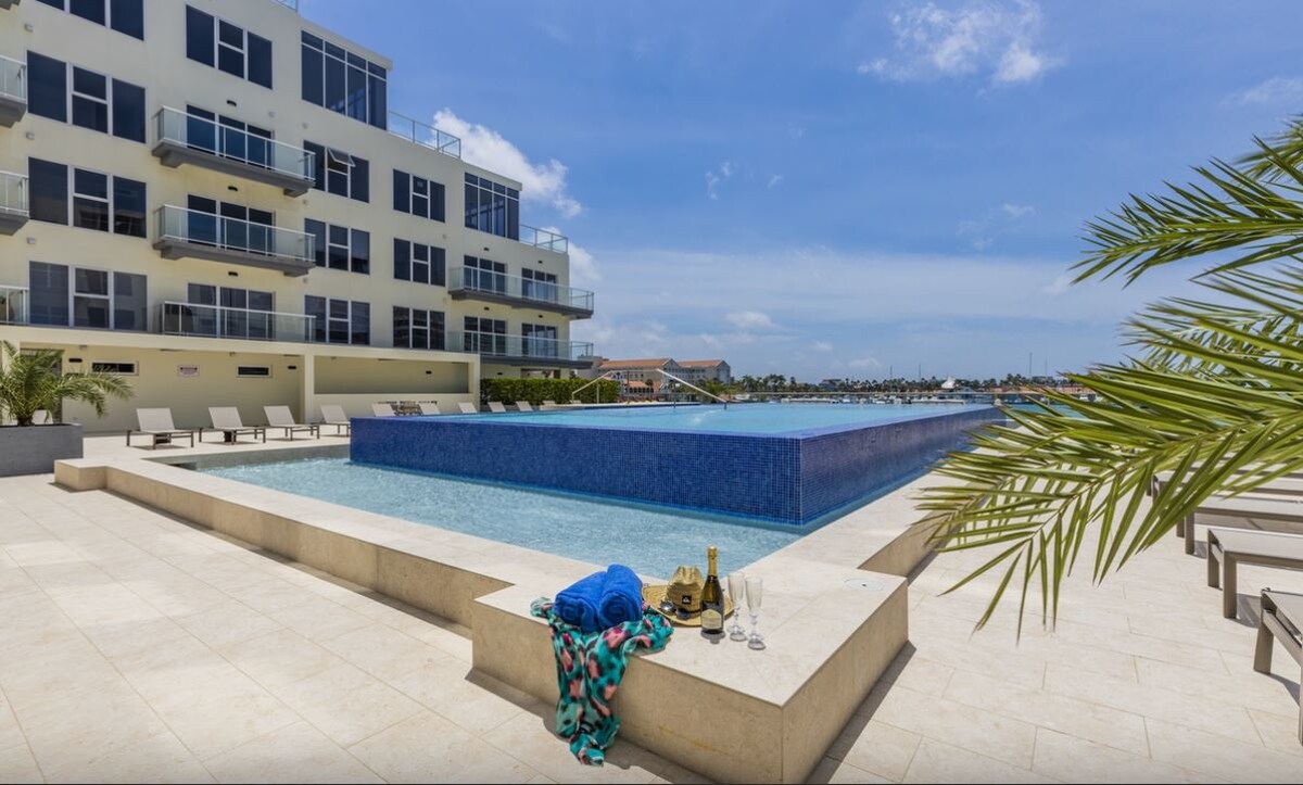 この美しいワンルームは、アルバの青い色を反映し、とてもモダンで清潔なデザインで、とても快適なキングサイズのベッドとキングサイズの枕、完全に機能的なキッチン、美しいウォークインクローゼット、スパのようなレインシャワーを備えたモダンなバスルームを提供しています。 建物の最上階にあり、アルバのダウンタウンと港の絶景が見えます! インフィニティプールと屋上の360度ビューのジャグジー、水辺とクルーズ船を見渡せる最先端のジムをお楽しみください!