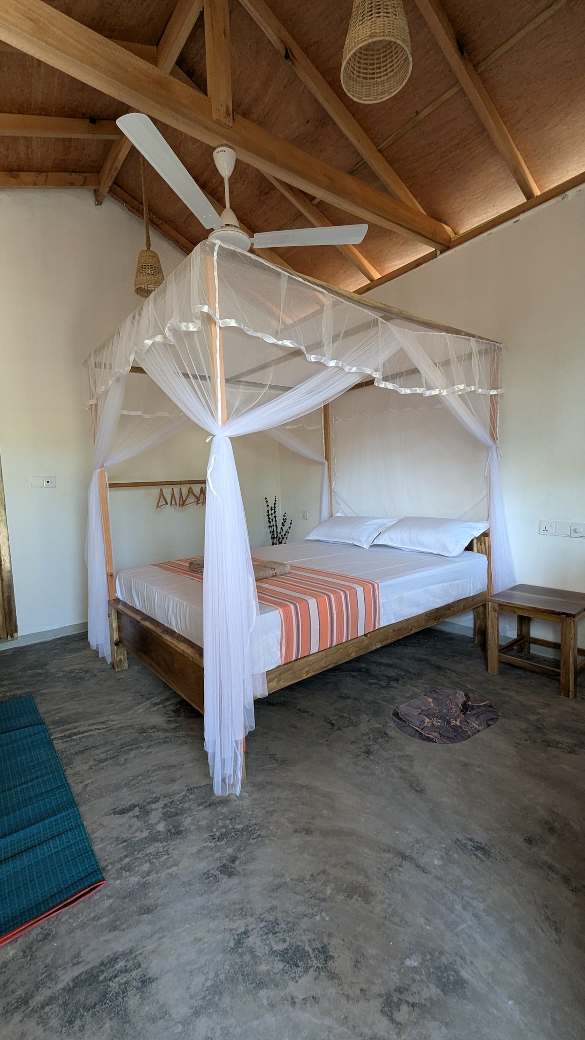 Lodge, two minutes walk from the beach, located between two major surf points. Cozy and bright room perfect for couples or small families. Features a queen-size bed with mosquito net, private bathroom, and refreshing outdoor shower. Equipped with, ceiling fan, and high-speed WiFi. Enjoy natural wooden decor, blackout curtains, and a private outdoor sitting area—ideal for relaxing after a day out. A peaceful, comfortable stay close to nature.