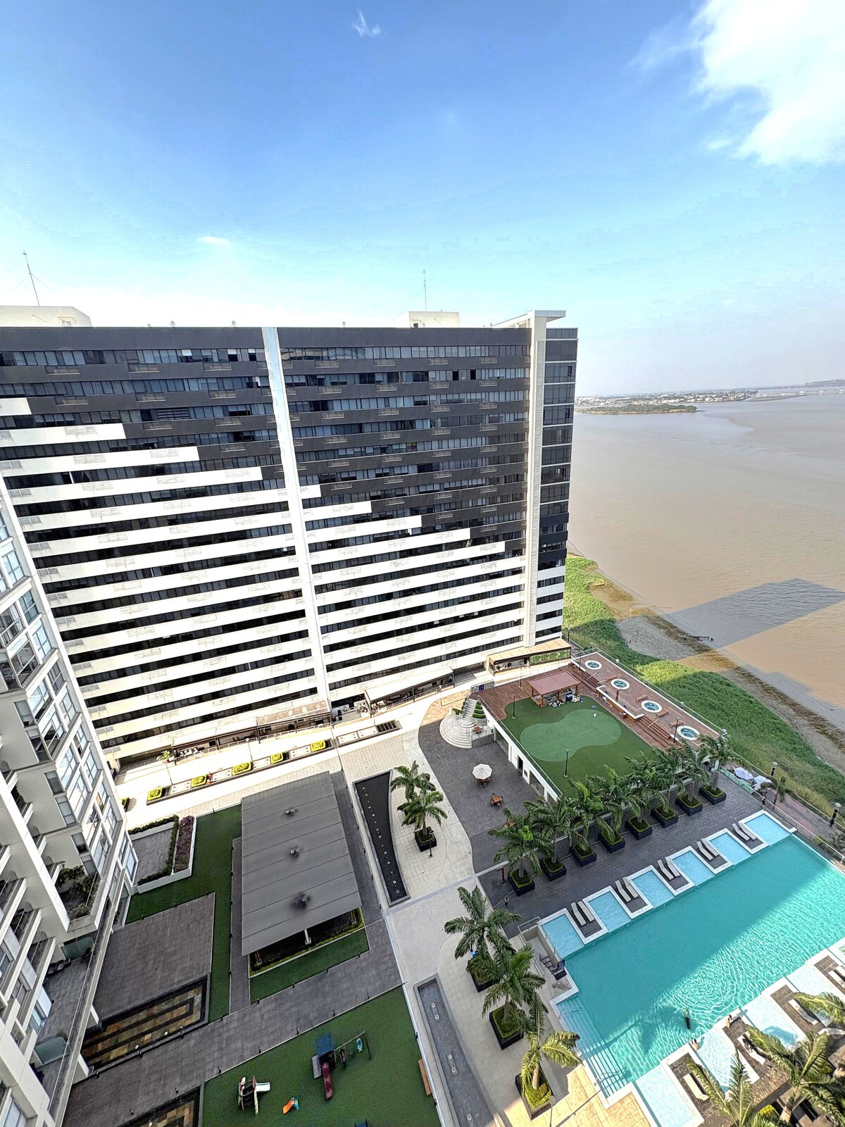 📍 Suite confort en Puerto Santa Ana (Bellini), ideal para escapadas en pareja, viajes de trabajo y estadías cortas o prolongadas. 🛏️ Cama de 2½ plazas, sofá cama alto (dimensional) y sofá cama auxiliar. Cocina equipada, 🧺 lavadora y secadora, 📺 Smart TV 65” en sala y 40” en dormitorio, 🌐 internet rápido, ❄️ aire acondicionado y 🚗 parqueo. 🌅 Vista lateral al río Guayas, 🔒 seguridad 24/7 y generador. 🏊♂️💪 Piscina y gimnasio disponibles solo para estadías mayores a 15 noches.