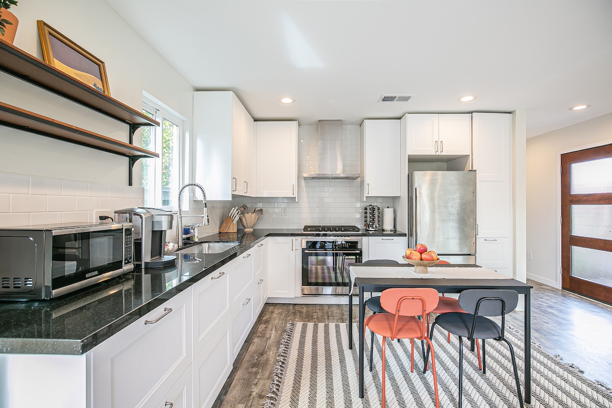 最高のAirbnb:スタイル、快適さ、ロケーション。 Airbnbの手数料とTOT税は、ゲストではなくホストが支払います。 1ベッドルーム、豪華なバスルーム、フルキッチン、コーヒーメーカー、品揃え豊富なパントリー、ダイニングセット、快適なソファ、オットマン。 豪華なシャワー:レインシャワー、カスケードシャワー、または手持ちシャワーヘッド。バックライト付きの鏡。 ネストヒーター、ハードウッドのフローリング、ポータブルダイソンのエアコン。 専用玄関。歩道には自動点灯の照明、藤のトレリス。専用駐車場。オーガニック野菜と果物の庭。パティオ。