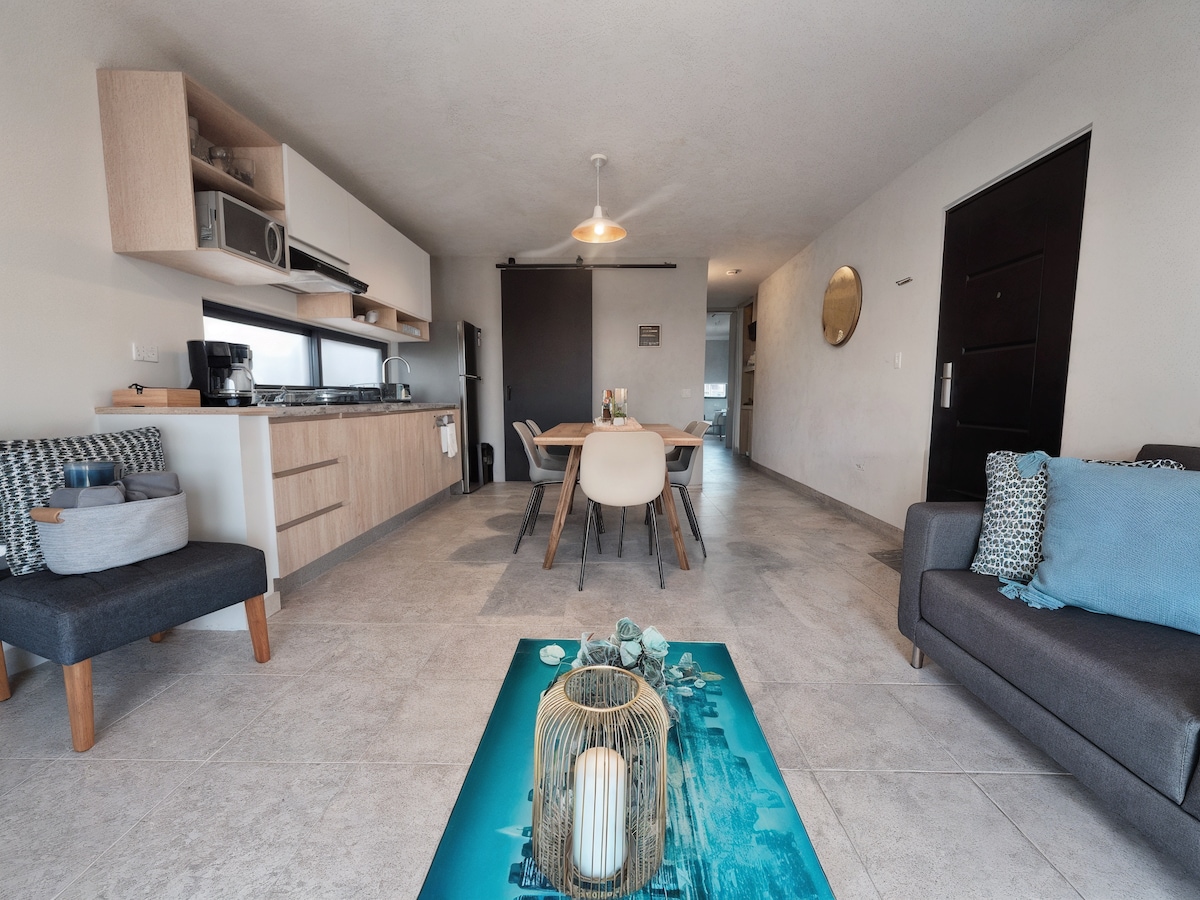 エンジェロポリスの商業地区に位置する65平方メートルのロフト。プエブラの星と地域最高のショッピングセンターやレストランから数歩のところにあります。プライベートテラス、キングサイズベッド、ホームシアター付きベッドルーム、プエブラの星と火山のパノラマビュー。冷蔵庫付きの一体型キッチン。ネスプレッソマシン。レインシャワー付きバスルーム。バニティミラー。洗濯乾燥機。屋内には石英カウンター。独立したエントランス。屋根付きの専用駐車場。24時間警備。