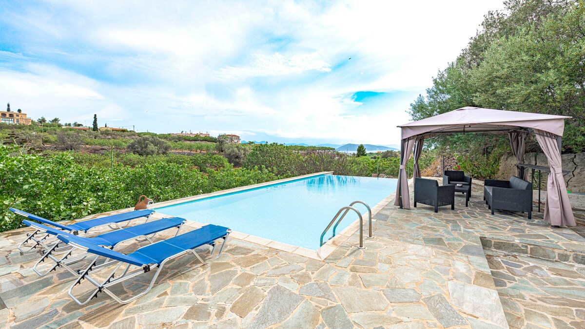 広々とした170平方メートルのヴィラで、あらゆる快適さを提供します。 石造りのバーベキューと薪オーブン付きプール。 オーナーは、ほぼすべての果物や野菜を無料で味わえるオーガニックガーデンを持っています! アテネのほとんどを結ぶ高速道路の出口から1 kmのところにあるため、アテネまで車で15分以内でアテネを訪れることができます。田舎の生活をお楽しみください。 すべてのお部屋がエアコン付きで、フルキッチン家電、暖炉、息をのむような景色などがあります。