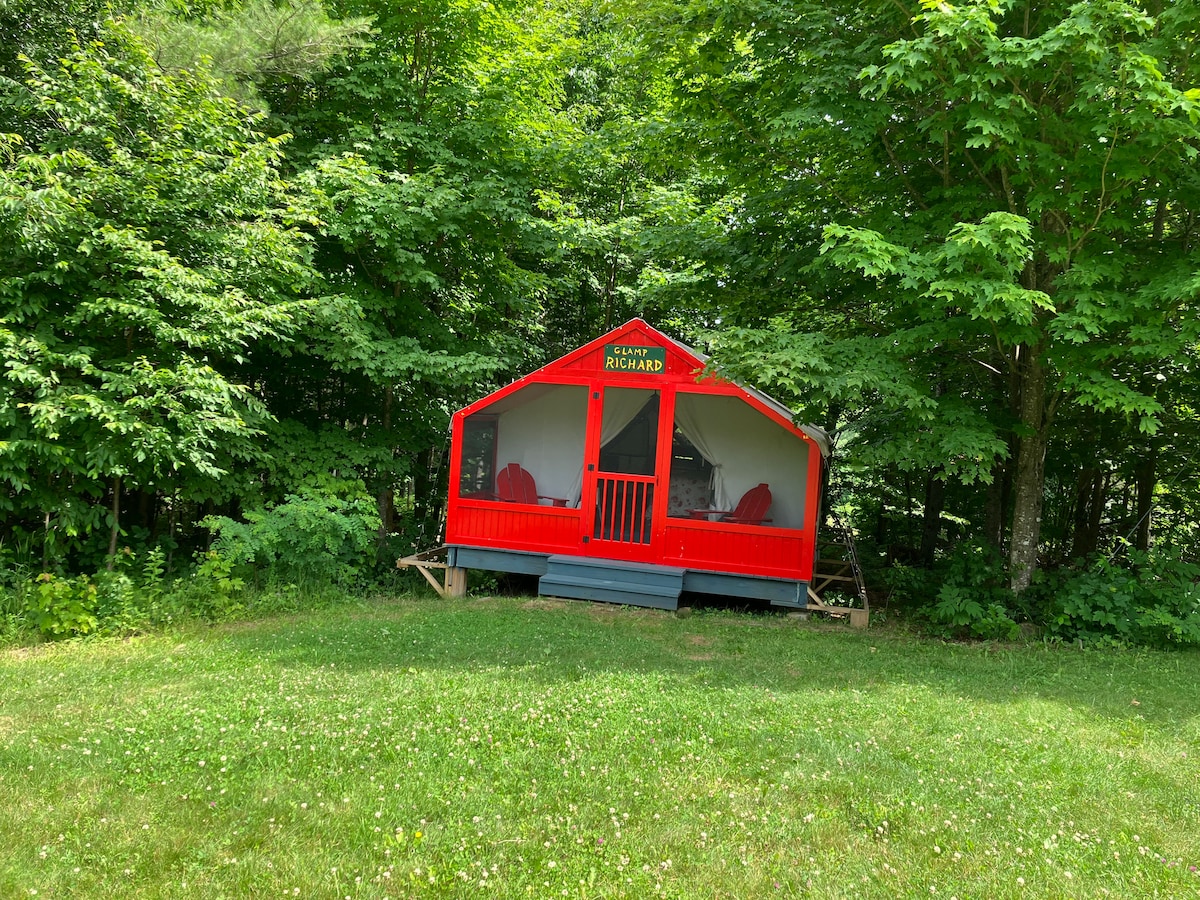 At the edge of a wildflower meadow with mountain views, this beautifully furnished glamping tent has a king-size water bed, sofa and private deck. Each tent has a kitchenette in the Lodge. There is a lovely Bath House. Enjoy wood-fired pizza (most but not all nights in the summer) and our wood hot tub ($25 for a private experience). 40 acres of meadows, woods, pond, streams and trails. Nightly bonfires, star gazing, a nearby lake and rafting in the Hudson River below.