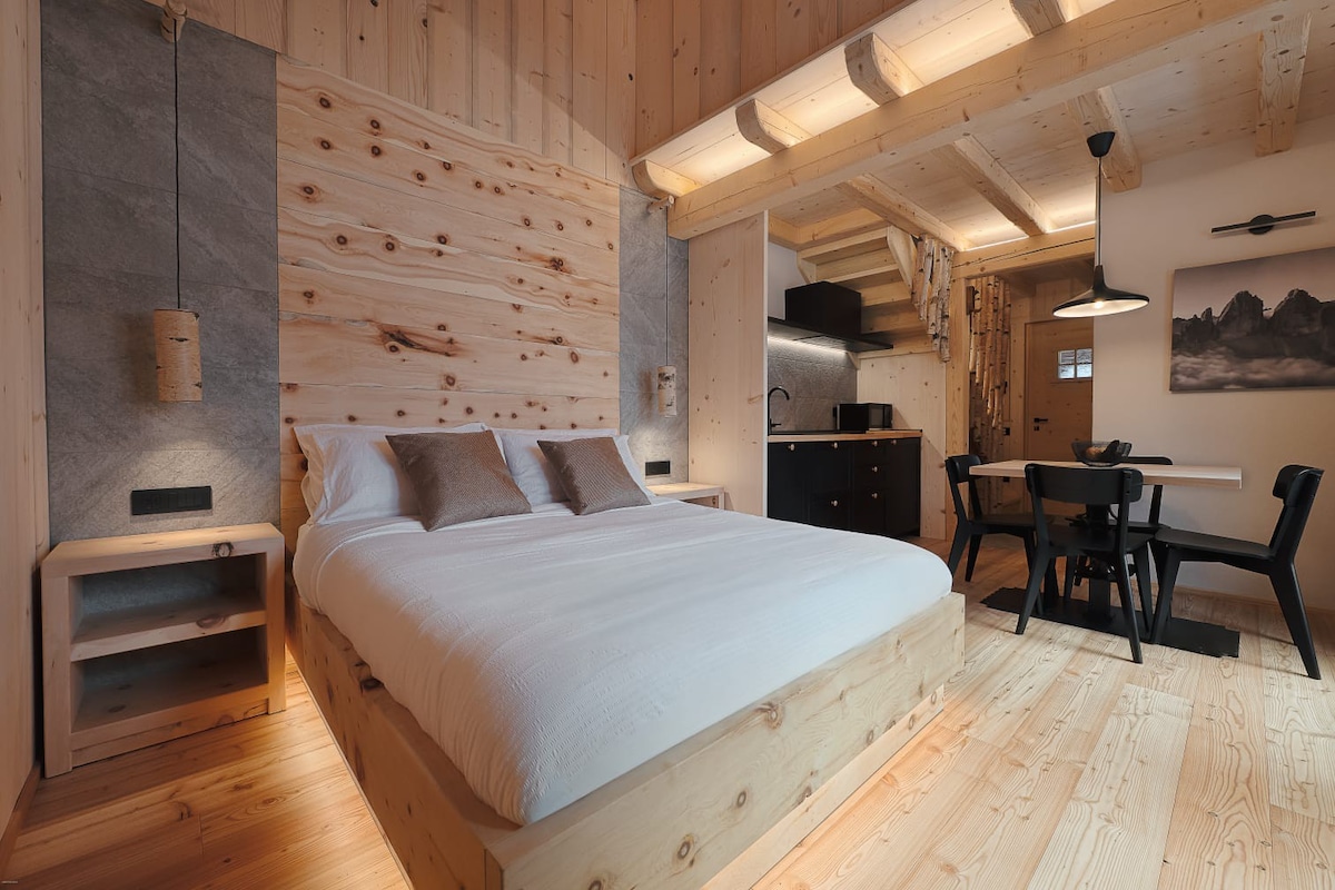 The apartment takes its name from the prestigious reconstruction project of the Fanton Bivouac in Forcella Marmarole in Auronzo, inaugurated in 2021. A very large room has a double bed set in a bridge wardrobe with a low ceiling while, in the space opposite, I obtained that my brother carpenter made a wooden structure that reproduces the unique experience of sleeping in a bivouac. Particularly suitable for families with children. Come on!