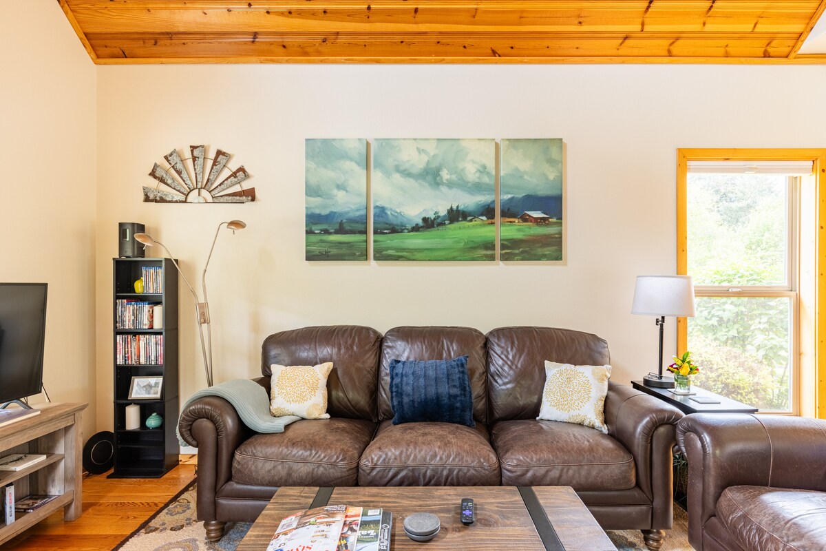 アウトレットモールから数分、木々に囲まれた穏やかで居心地の良い三角屋根の家で、波打つ小川を見渡すことができます。 ロフトへの階段は、快適なクイーンサイズのベッドとテレビがある部屋につながっています。 階下には、設備が整ったキッチン、ダイニングエリア、窓がたくさんあるリビングエリアがあり、景色を楽しむことができます。 テーブルと椅子、プロパングリルを備えたパティオもあり、美しい木々が散在する牧草地と水の景色を楽しむことができます。
