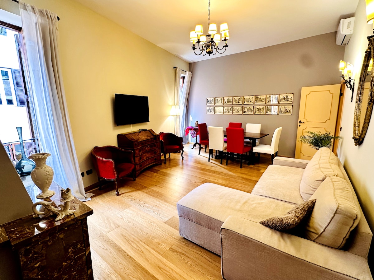 Newly refurbished, spacious sun-lit apartment in historic building located on the 4th floor (with elevator). Living/dining room, 3 balconies; 2 large bedrooms with 4 beds, bathroom and full kitchen with oven, washing machine, dishwasher, microwave. Original parquet and floors. Air conditioning, High speed fiber wi-fi and TV. Walking distance from Colosseum, Roman Forum, Circus Maximus, restaurants, metro to airport and Vatican. Cot available upon request for extra fee.