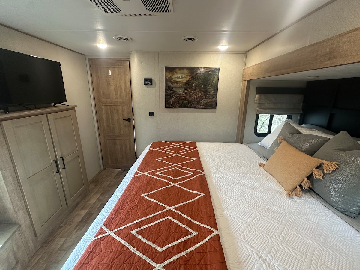 ✨ビーチマウンテンの裏手にある7エーカーの敷地内にある、36フィートのRVで山の景色を楽しむグランピング体験。✨ 🏔️キングサイズベッド、キングサイズのソファベッド、寝室とリビングルームに設置されたテレビ、フルサイズのシャワー、クローゼットスペース、大型冷蔵庫をお楽しみください。人里離れて静かでありながら、ビーチマウンテン、シュガーマウンテン、ブーン、ワタウガ湖、シュガーホロウに近い立地です。キッチンの窓からは山の景色が楽しめます。 ✨ロマンチックな旅行、特別なお祝い、または山でのリフレッシュに最適です。到着が遅くても、冷凍ピザとフルーツをお楽しみいただけます。