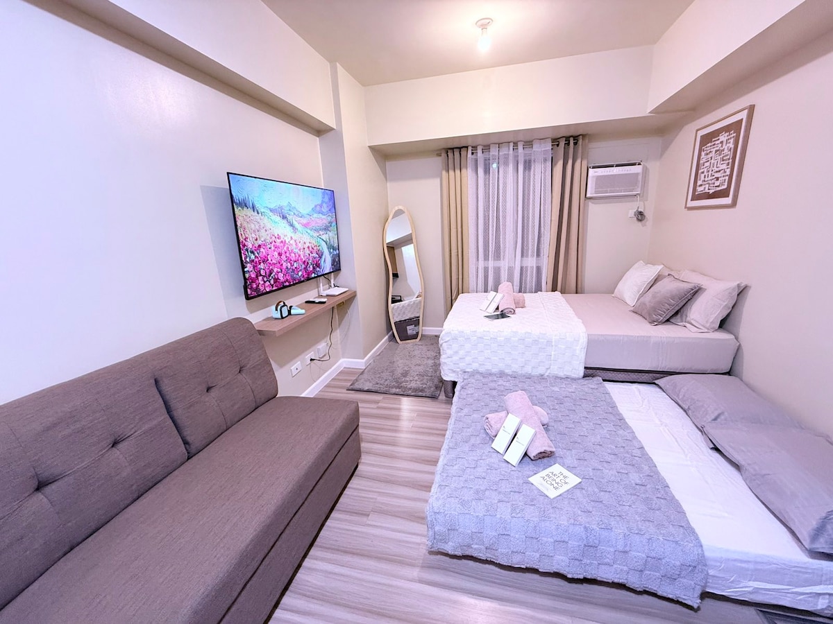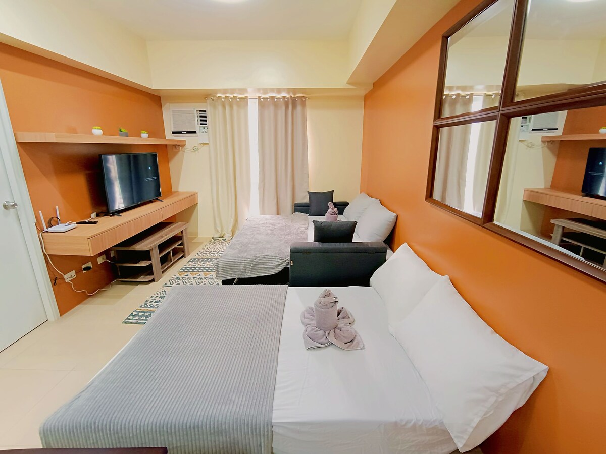 セブITパークの快適でスタイリッシュな宿泊先、The Amber Roomへようこそ! このフルエアコンのスタジオには、クイーンベッド、コンバーチブルソファベッド、高速Wi-Fi、Netflix、ワークデスク、遮光ブラインド、温水シャワー、洗濯機/乾燥機、冷蔵庫と電子レンジを備えた簡易キッチンがあります。 プールとジムをご利用いただけます。カフェ、コワーキングスペース、アヤラモールまで徒歩で行けます。ビジネスでも休暇でも、ゲストが何度も訪れたがるお部屋でリラックスしたり、充電したり、地元の人のようにセブを体験したりできます。