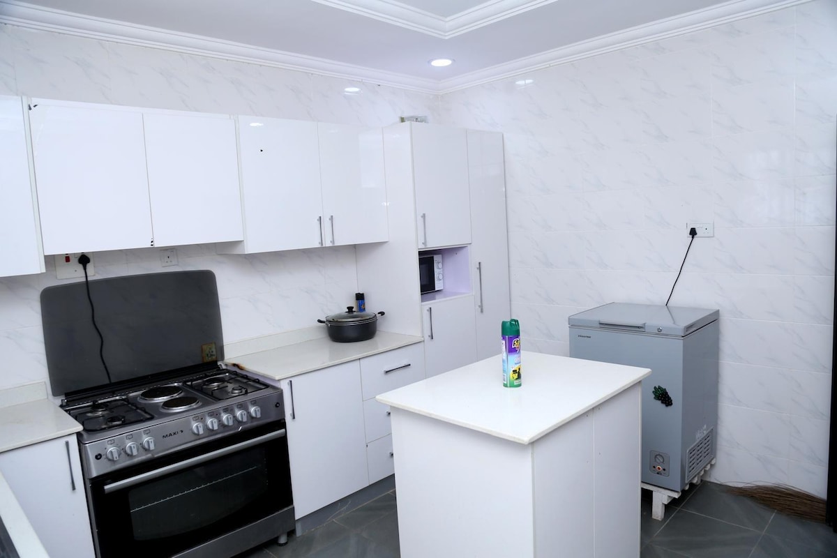 長期滞在向けの料金、ファイバーインターネットWi-Fi、3台のエアコン、温水、ソーラーインバーターシステム、セキュア、大きなベッド、専用の裏庭、専用の駐車場、広々としたキッチン、子供用プレイグラウンド、スマートテレビ、新鮮な空気を集めるための近くの木々/森など。こちらの落ち着いた宿泊先で、ご家族一緒におくつろぎください。適切な作業スペース/デスクが設置されています。チェックイン時に10,000ナイジェリアナイラ相当の電気ユニットが提供され、その後はゲストが電気料金を負担します。