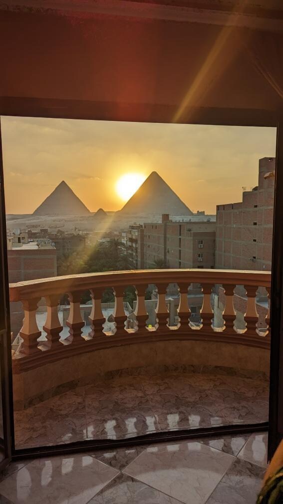 Welcome to our apartment! Just 5 minutes’ walk from the Sphinx and Pyramids entrance, with a stunning balcony view. Located in a safe and lively local area near restaurants, cafés, fruit shops, markets, and pharmacies. The apartment is fully air-conditioned, with fast unlimited Wi-Fi, a well-equipped kitchen, clean sheets, fresh towels, and a calm atmosphere. Probably the best place to enjoy the Pyramids view!