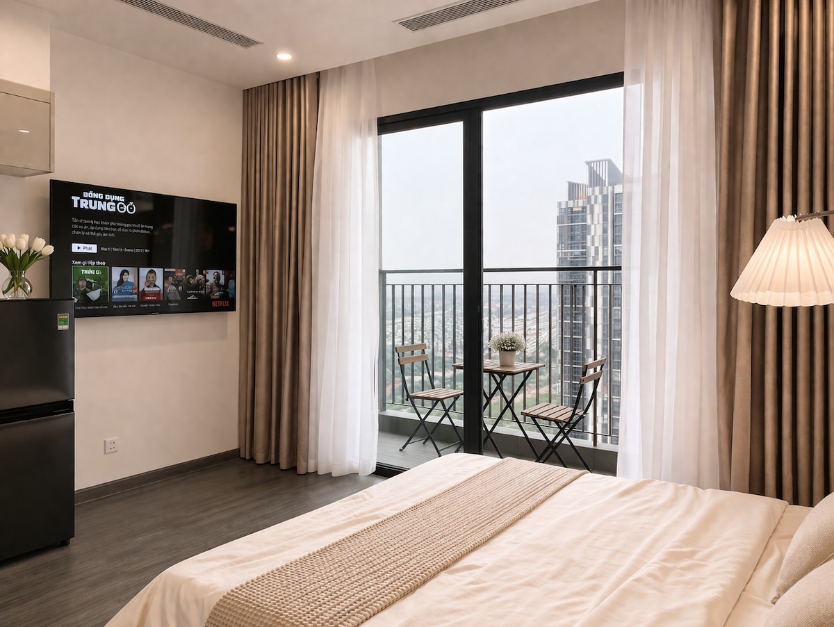 Căn phòng ngập tràn lãng mạn, tận hưởng netflix & chill Với thiết kế lấy tone trắng đen làm chủ đạo, decor thanh nhẹ với phong cách art châu Âu, cùng sắc đèn vàng ấm cúng, ban công hướng ra ngoài thành phố, máy chiếu có Netflix để chill buổi đêm, khu bếp nhỏ để tự nấu những món ăn thật ngon cho bản thân,...chắc chắn sẽ giúp bạn có những trải nghiệm chữa lành tâm hồn thật đặc biệt.