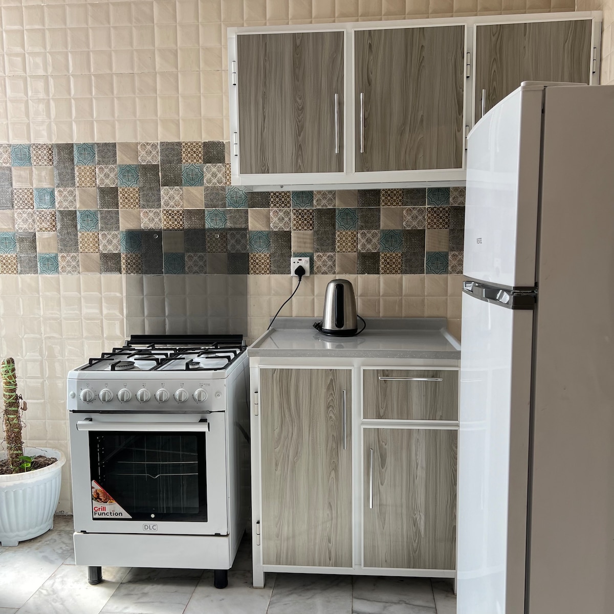 Forget your worries in this spacious and serene space consisting of 1 double bed and 2 single beds. inside the compound a super market ,laundry , bakery . Full air conditioning and 24/7 electricity