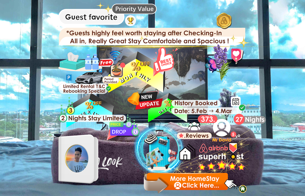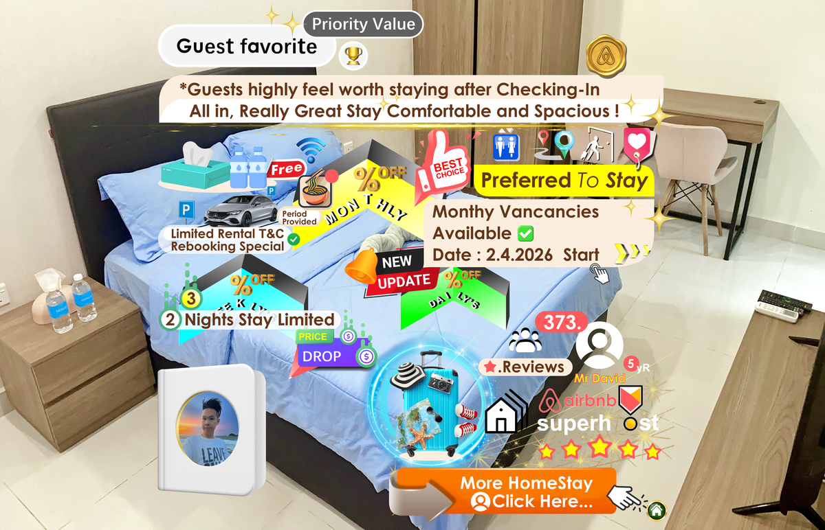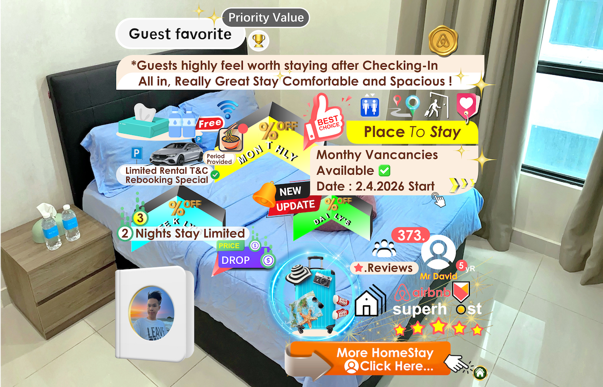 私のホームステイは、空港、バスターミナル、ショッピングモール、主要な観光スポットの近くのとても便利な場所(ブールバードショッピングモール)にあります。 したがって、私のホームステイは出張者、カップル、そしてお友達やご家族との旅行に適しています ゲストはプール、ジム、サウナ、スチームバス、ショッピング、食事の場所を利用できます。 私のホームステイでのご旅行とご滞在をお楽しみください。また、クチングの必見のアトラクション、サラワク文化村などを探索してください。