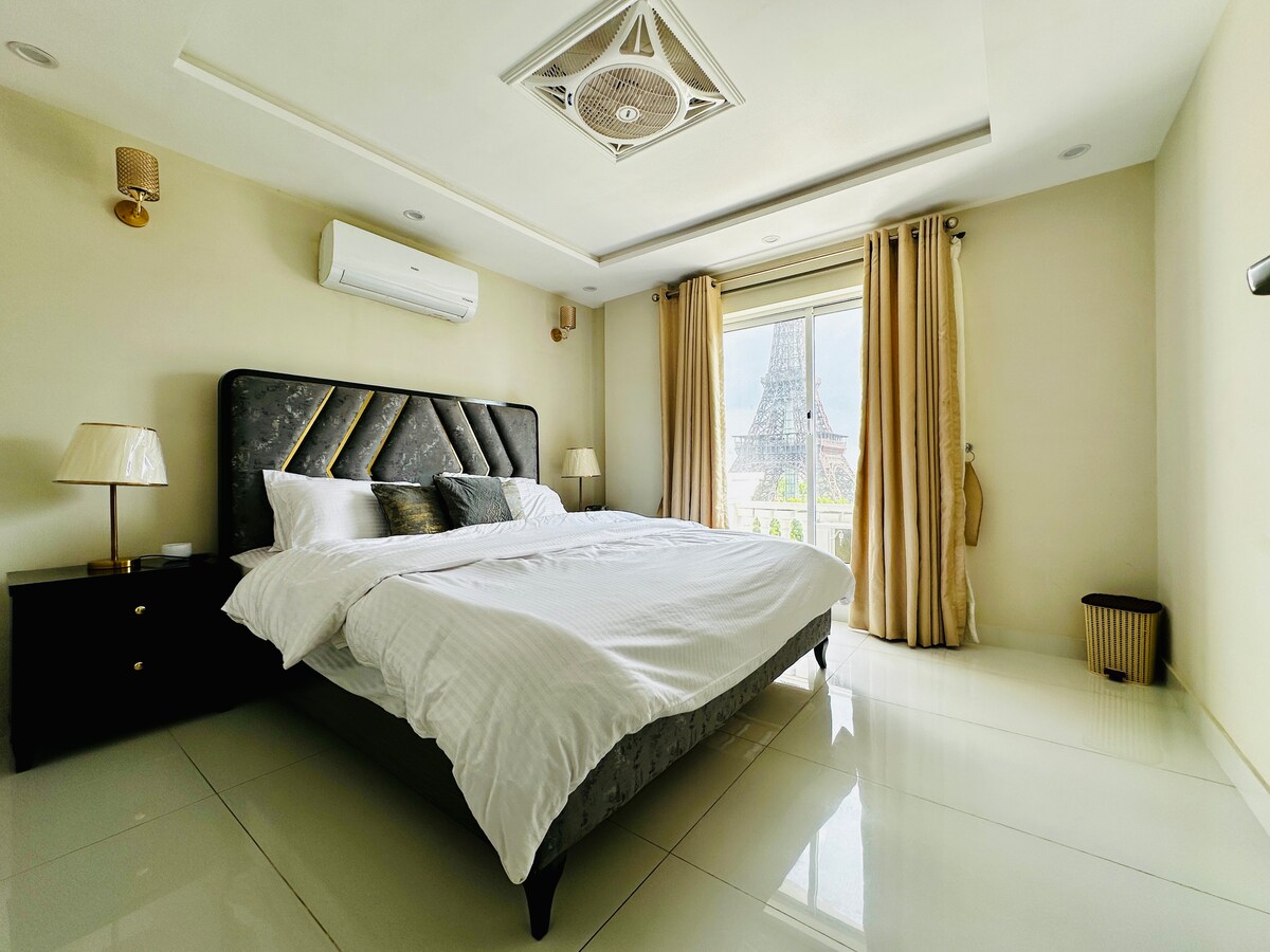Luxury 1-Bed Apartment | Eiffel View | Staysia Rooms 1 - Eiffel View Balcony for morning coffee 2 - Queen Bed with Floating Lights 3 - 2 Smart LCDs (55” in bedroom) + Netflix 4 - 2 ACs (1 free, 1 optional +PKR 2000) 5 - High-Speed Wi-Fi, peaceful ambiance 6 - Dining for 4, plates & cutlery 7 - Self Check-in/out + Welcome Basket 8 - No parties, drugs, alcohol, or loud music 9 - Stylish décor & professional hospitality 10- Comfortable, cozy and Spacious