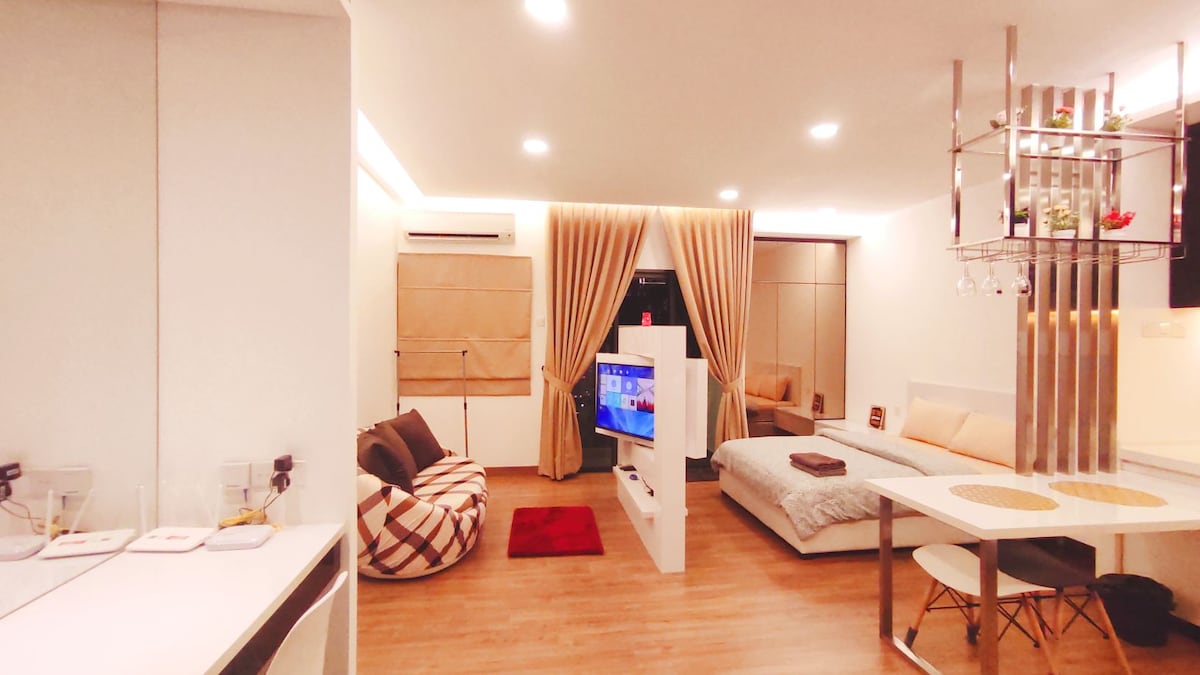 This new designer studio is located at Level 39, the highest floor in Symphony Tower. It is a city view unit that you will have a breathtaking view. Symphony Tower is easily accessible via Silk Highway, Cheras-Kajang highway and Sungai Besi Highway. Shopping and restaurants are only within 5 minutes drive. Common facilities include swimming pool, children playgrounds, gym, sauna, steam and a golf putting green. This stylish place to stay is perfect for group trips.