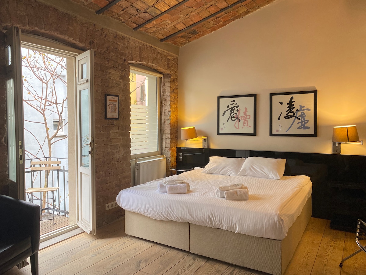 ロケーションが最高です。バルコニーからトプカプ宮殿の古い城壁が見えます。有名なアヤソフィアはすぐ近くにあります!スイートは50平方メートルで、クイーンサイズのベッド1台、ポータブルベッド1台(オプション)、モダンなデザインのバスルームがあります。この豪華なスイートはSublime Porte Hotelの最上階にあります。