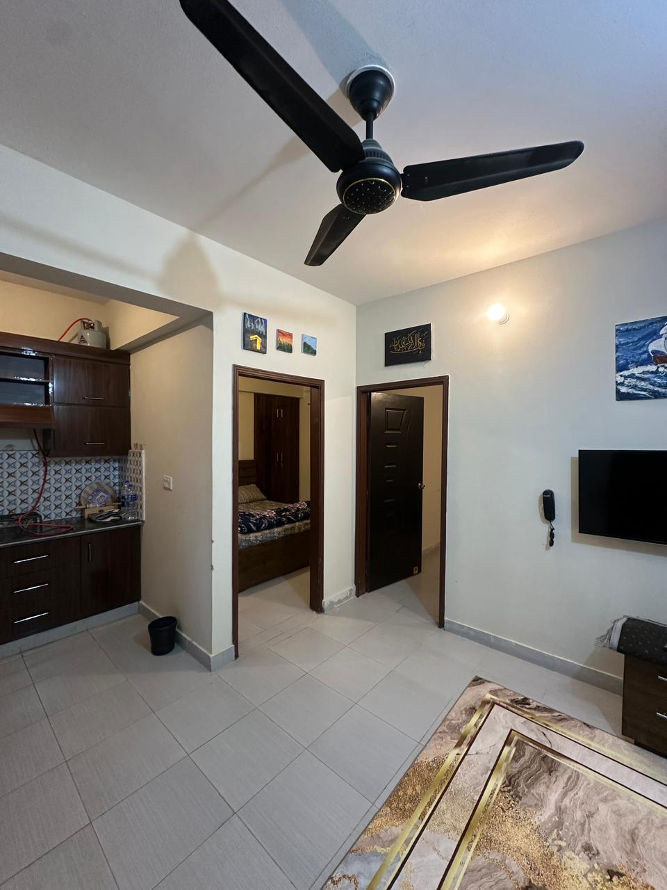 A modern studio apartment in Bahria Town Karachi with a private balcony, one bedroom area, one bathroom, and a fully equipped kitchen. Guests enjoy air conditioning, hot water, fresh towels, and all utilities included. The building offers 4 passenger and 4 cargo elevators, 24/7 security and reception, free parking, and on-site grocery and dining. Perfect for families, solo travelers, and small groups seeking comfort and convenience.