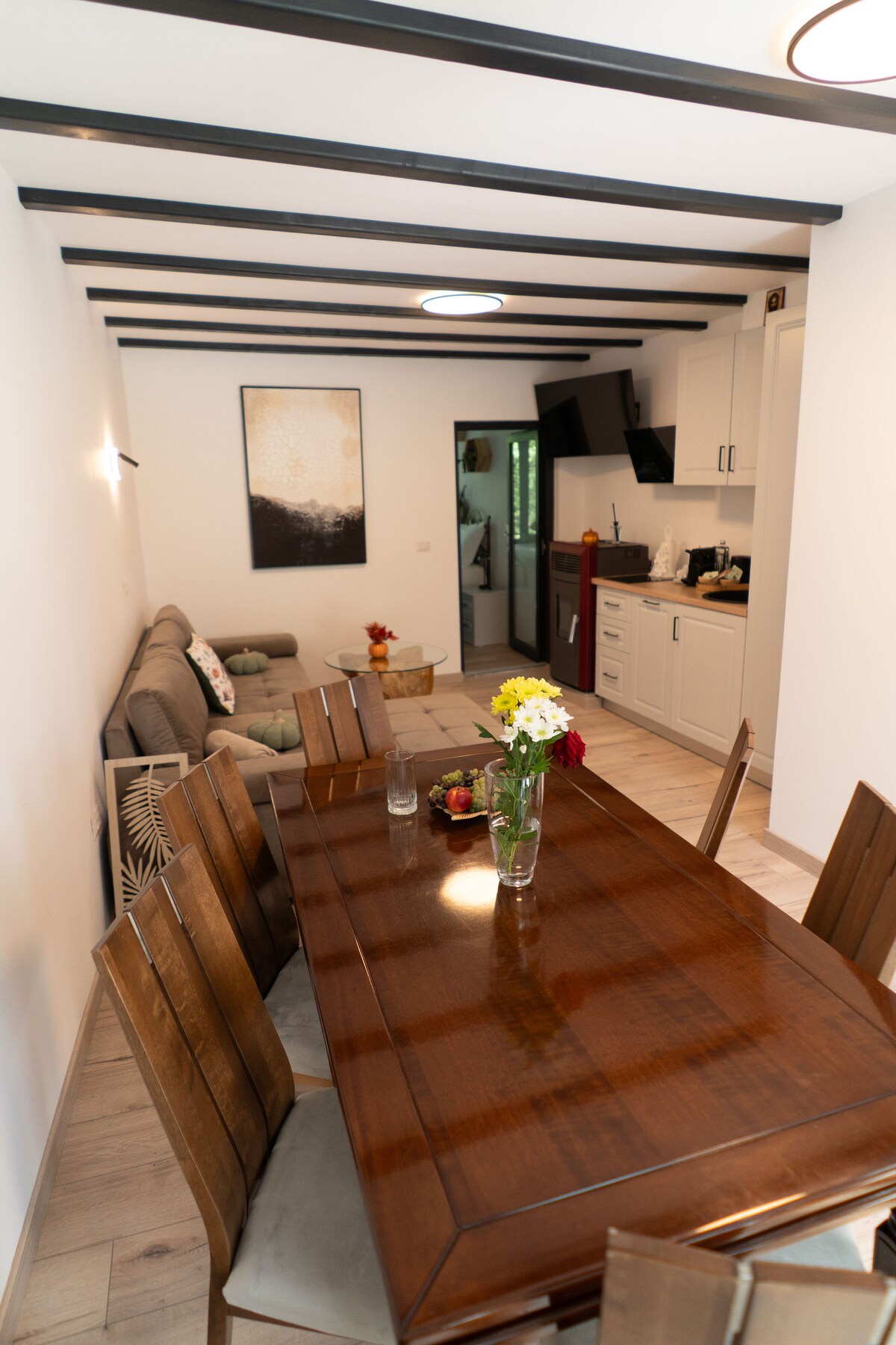 Apartamentul de lux Ikabane, situat în inima pensiunii, oferă 90 mp de spațiu elegant și confortabil, ideal pentru familii sau grupuri de până la 4 persoane. Decorul modern, livingul generos și dormitorul primitor creează un ambient relaxant. Piesa centrală este jacuzzi-ul privat din cameră, perfect pentru momente de răsfăț și liniște. Cu dotări complete și multă intimitate, apartamentul este alegerea ideală pentru odihnă, relaxare sau ocazii speciale.