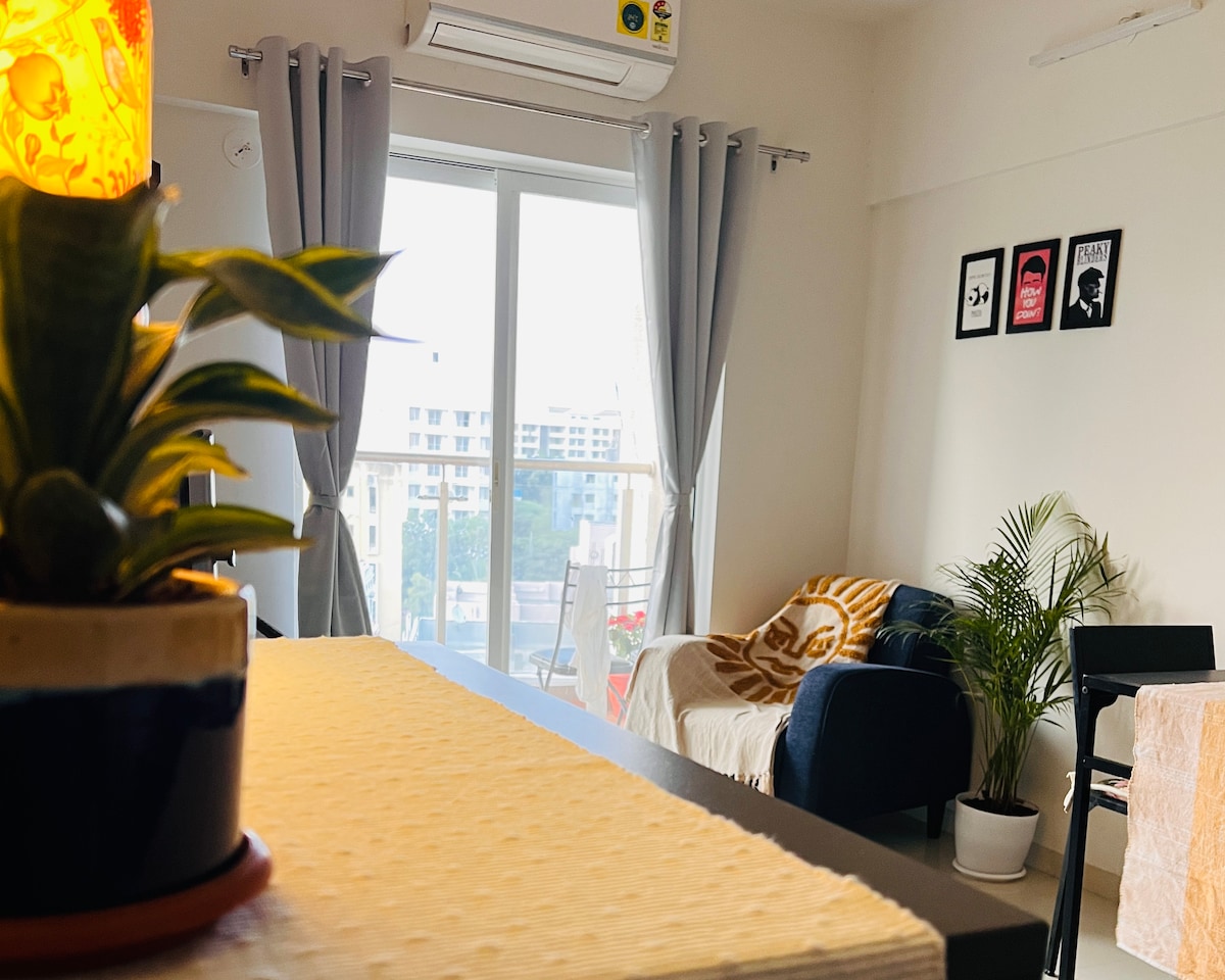 A Quiet, Cozy Studio Apartment on the 15th Floor 🌿 3.5 km from Balewadi High Street | 🚗 700m from Mumbai-Bangalore Highway Wake up to the soothing sounds of nature—the call of peacocks, the rustling of leaves, and breathtaking views of Baner Hills, Pashan Lake, and the city lights, all from the comfort of your bed.