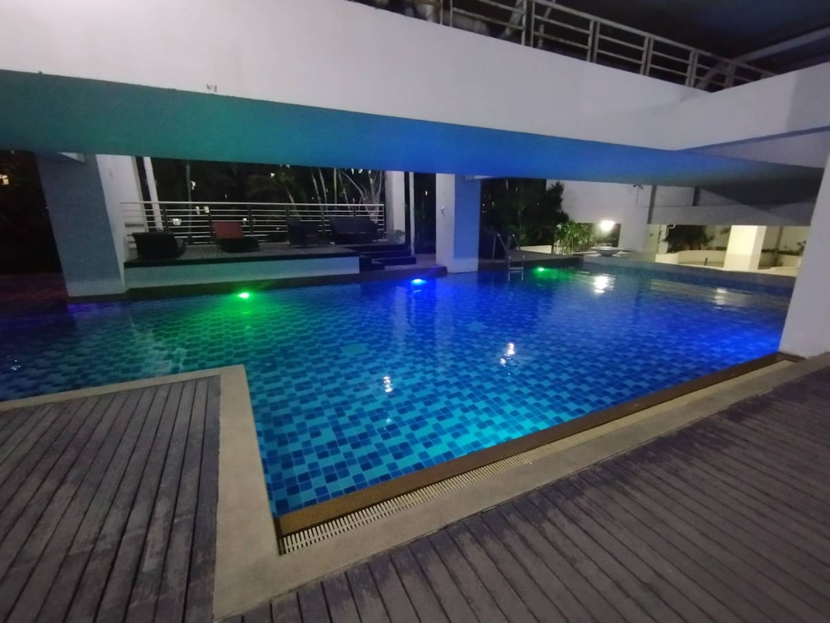 私のアパートをお選びいただき、またご宿泊いただきありがとうございます。素晴らしいタイの旅をお過ごしください。 家はRAMA9にあり、2024年に納品されたロフトアパートです。お部屋の広さは約40平方メートルで、寝室、リビングルーム、ダイニングルーム、キッチン、バスルームが1つずつあり、大人3名様が簡単に収容できます。(tps: ご予約の宿泊人数が1〜2名様の場合、デフォルトでは寝室にベッドが1台しかありません。ソファベッドを追加する必要がある場合は、ご予約時に人数を3名様としてご記入の上、ご予約後にご連絡ください。チェックイン前にスタッフがソファベッドを準備いたします) 予約料金には、宿泊施設全体の使用料、フィットネスセンター、プール、共有オフィススペースの使用料が含まれます。