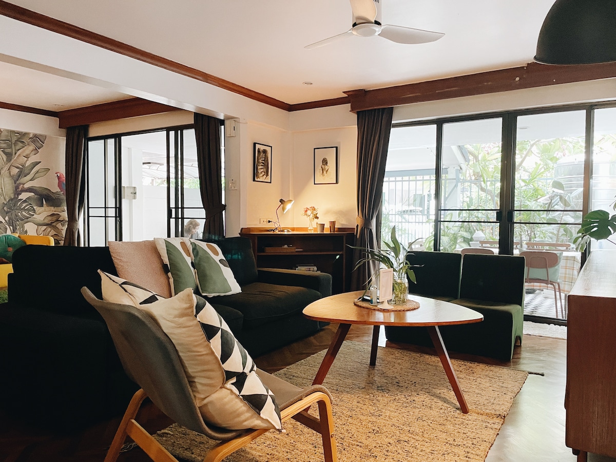 Amazing retro entire home which can comfortably accommodate up to 5 people including 3 bedroom, 2 bathroom, Kitchen, Patio garden and huge living area. The house located in the quiet soi but very close to the best local and international restaurants, coffee shops, fun bars and shopping area BKK has to offer. BTS : 5 mins 🚗 Ekkamai Station Thonglor street EmQuartier EmSphere Jodd fair Cafe Thieves DonDonki Mall Big C super market Here hai Restaurant seafood White wood green spa & Wellness