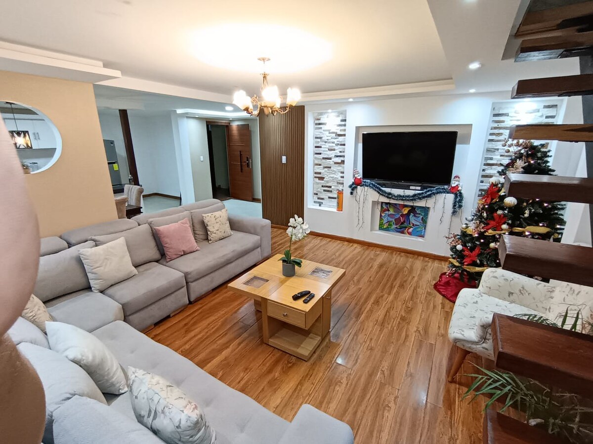 この非常にエレガントでモダンでスタイリッシュなアパートで、家族や友人と忘れられない経験をしてください。 3階にあり、家具が完備されており、街や山のパノラマビューが楽しめます。中心部に位置し、とても安全です。リビングルーム、スマートテレビ、ダイニングルーム、キッチン、社交用バスルーム、寝室3部屋、フルバスルーム2部屋、バルコニー2つ、テラスへのアクセスがあります。Wi-Fi、インターネット、温水(24時間)、1台分の専用自動ガレージ。 ベッド:3台(クイーン2台、フル1台) 定員:6名様