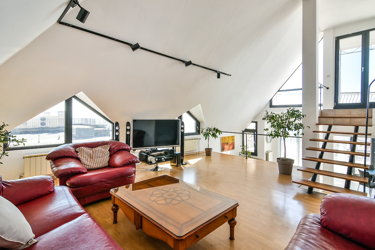アパートは、メインの歩行者ゾーン、レストラン、バーのすぐ隣にエレベーターがある豪華な建物の最上階にあります。 快適な滞在のために設備が整っており、素晴らしい広々とした日当たりの良いテラスがあり、街のスカイラインの壮大な景色を眺めることができます。 すべての家具はユニークで、素晴らしいセンスで選ばれています。 必要な家電は全て揃っています。 平日は無料駐車場はありません。