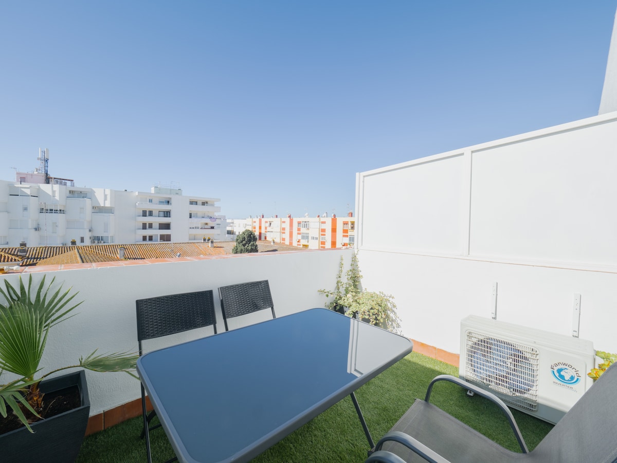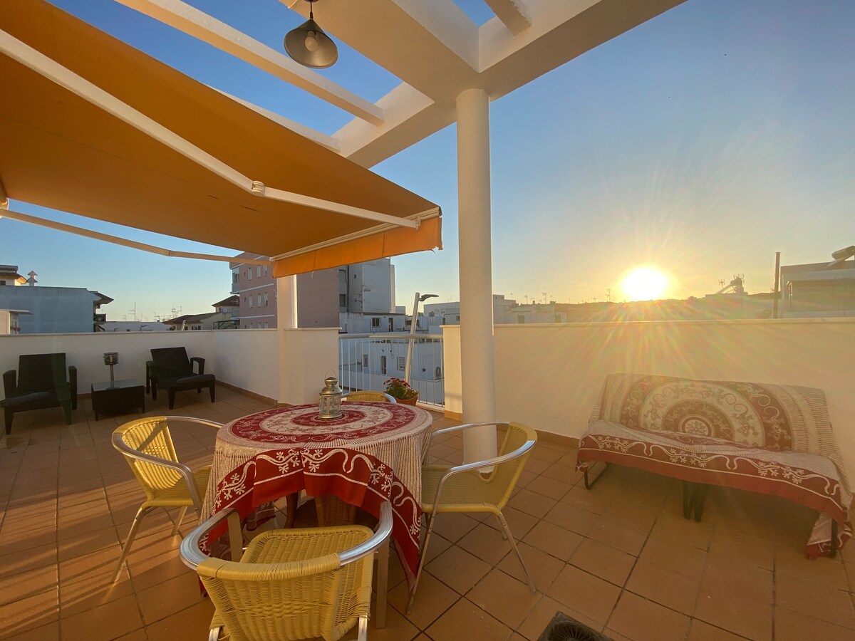 Ático en el centro de Barbate con terraza equipada con hamacas, barbacoa, sofá, mesa y sillas. Wifi, aire acondicionado y sofá cama para 2 personas extra. Ideal para parejas o familias pequeñas, a pocos minutos de la playa.