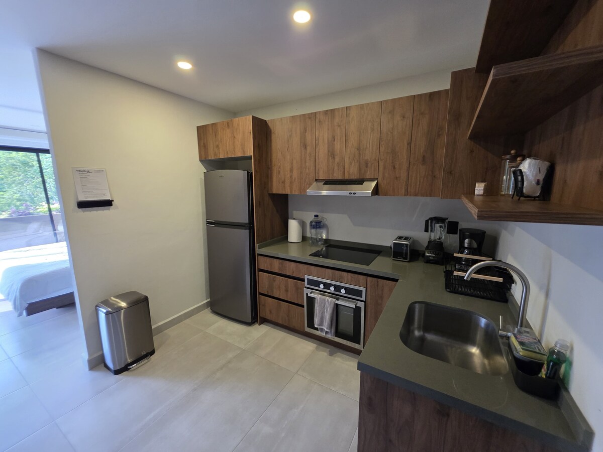 🌊 Disfruta en este moderno y acogedor condo con una vista espectacular al mar. 🏔️ Ubicado en una colina, por lo que hay escaleras y senderos rodeados de naturaleza para caminar y disfrutar del paisaje. No cuenta con elevadores pero puedes solicitar un carrito de golf para que te apoye en tu check in y check out. Cuenta con alberca privada, WiFi, AC, accseso a la playa y a las instalaciones de Hotel