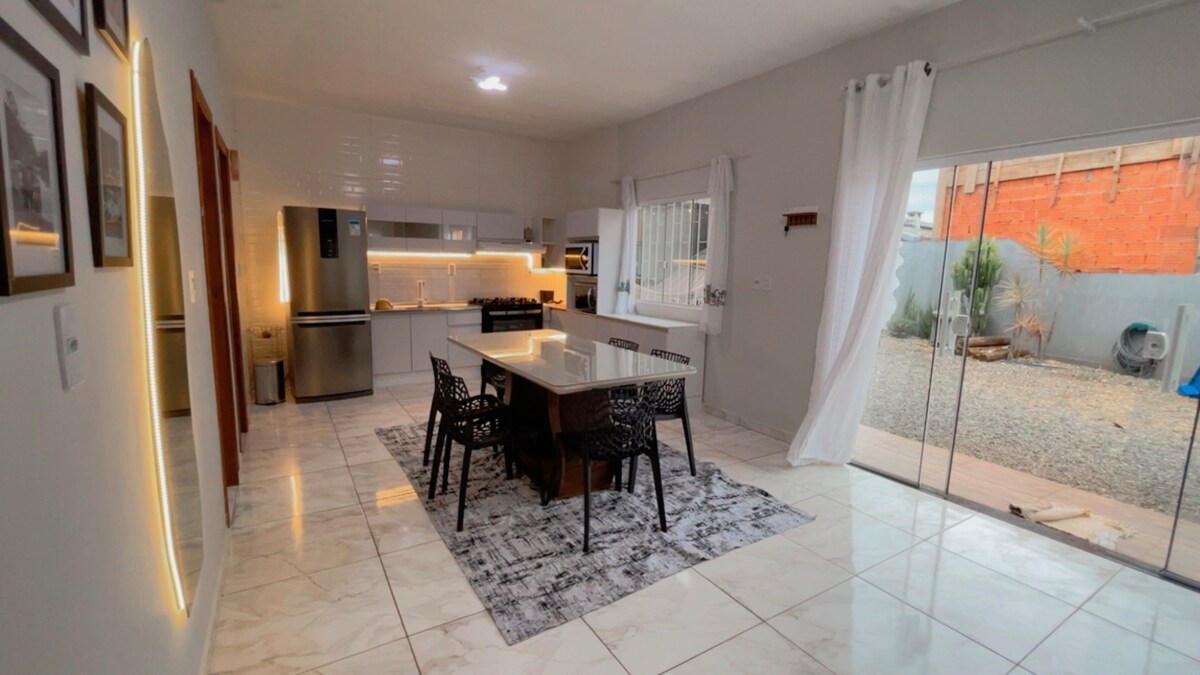 Casa térrea, confortável e completa, em rua residencial tranquila, a 750m da praia e cerca de 15km do Beto Carrero. Ideal para famílias com pets. São 3 quartos amplos (1 suíte), 2 banheiros, ar-condicionado em todos os ambientes, lareira e churrasqueira à carvão. Cozinha completa, lavanderia com lava e seca, filtro de água gelada, sofá-cama, PlayStation 4, berços, banheira kids e garagem para até 3 carros. Oferecemos roupas de cama, toalhas de banho e sabonetes. Mercado com padaria na rua.