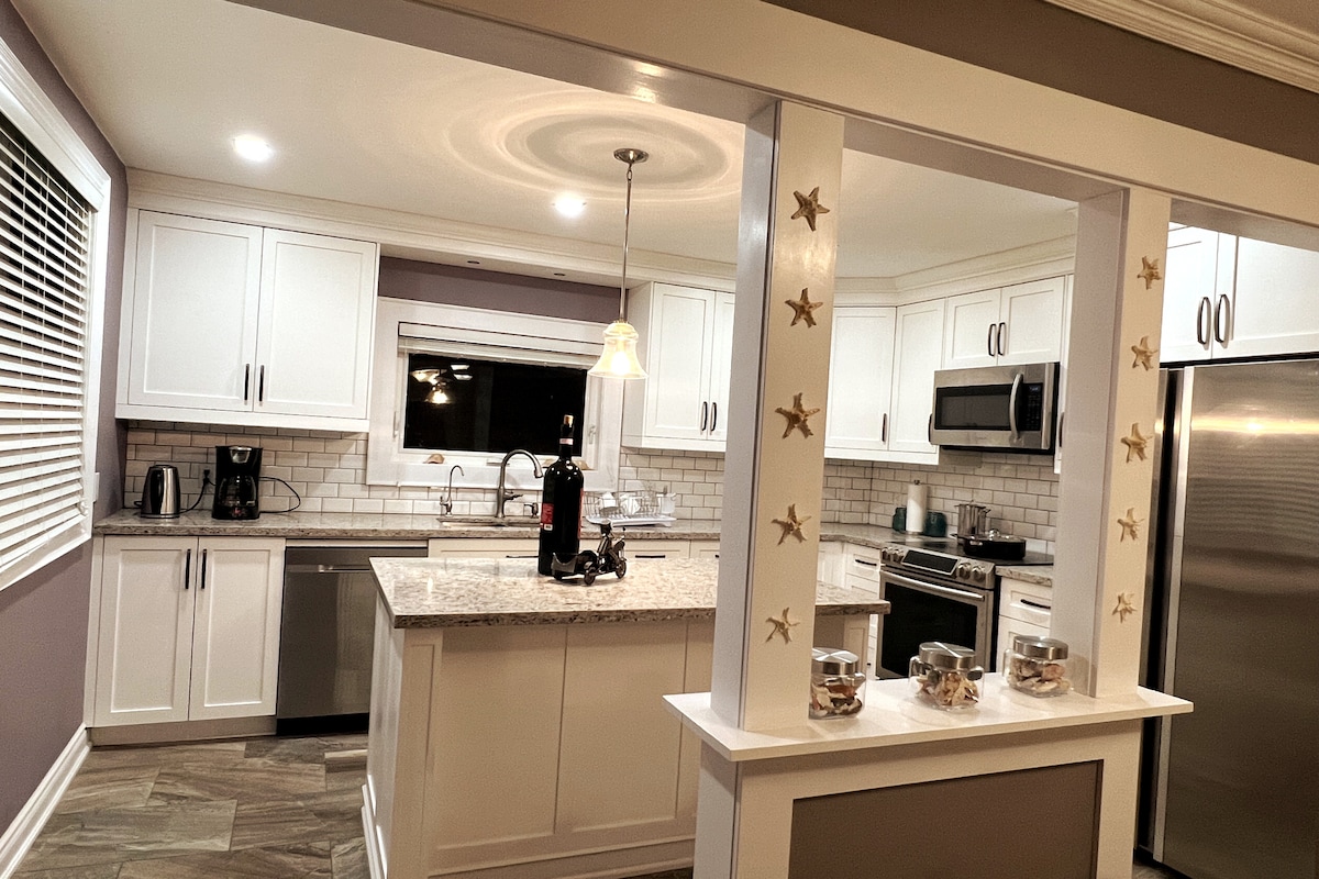 専用ドック付きウォーターフロント。 改装済みの高級住宅+新しいジャグジー、夏の夕日と朝日を眺めることができる街の湾の眺望。 ミネッツ・ポイントのビーチと公園まで徒歩圏内。4つの寝室と2つの引き出し式ソファ(クイーンとツイン)、3つのフルバスルームとサウナ、223平方メートル以上の広さ。 駐車場は3台分あり、隣の駐車場では追加の駐車場をご利用いただけます。 ガスバーベキュー、ファイヤーピット、ガスコンロ2台、高速Wi-Fi、77インチテレビ、洗濯機/乾燥機、48アンペアの電気自動車用電源。 マリーナまで数分で、シードゥーやボートをレンタルできます。 高級レストラン、パブ、お店まで徒歩圏内。 カイトサーフィン&氷上釣り
