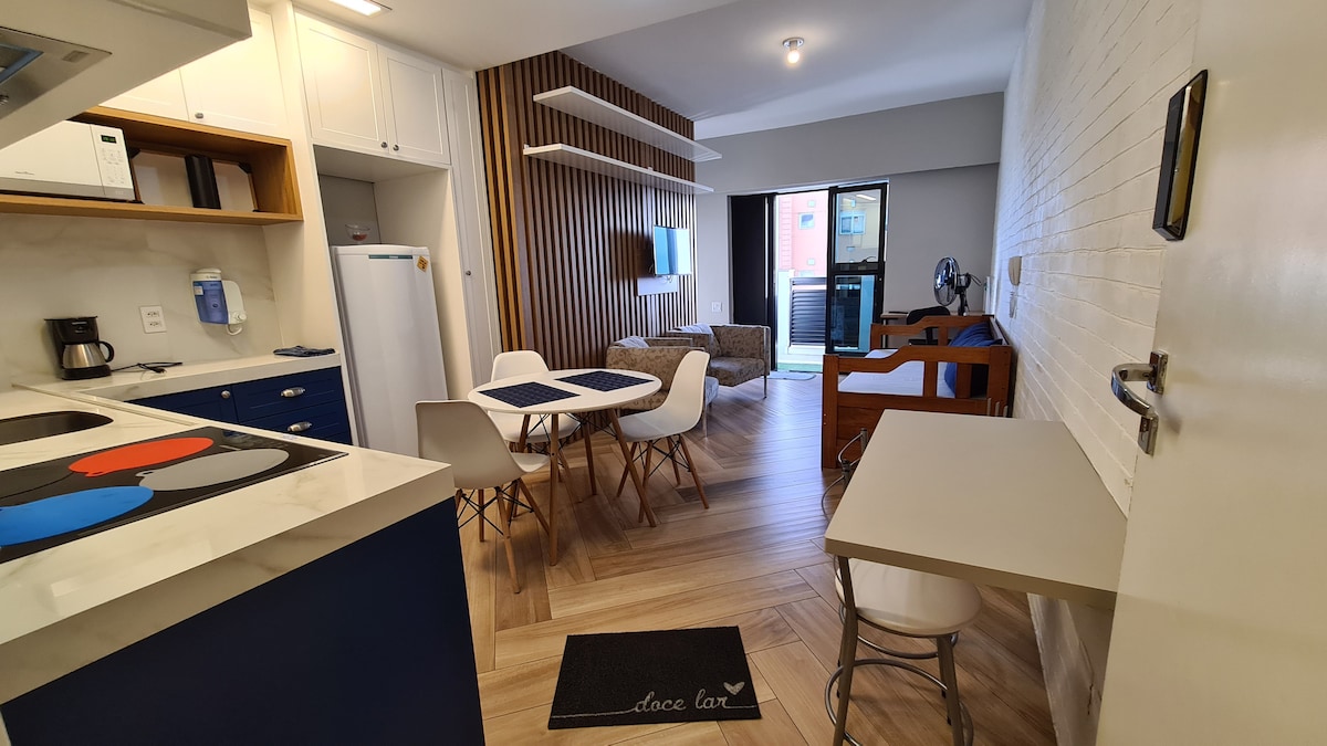 バルエリ(サンパウロ州アルファビル)のベタビル地区に位置する新しいワンルームアパートメント。 2つのシングルベッドがあり、それらは2つのダブルベッドになることができます。 この完全にスタイリッシュな宿泊施設の利点を備えたモダンな魅力をお楽しみください。 家具は心地よいタッチと、休息やホームオフィスに最適な機能を備えています。