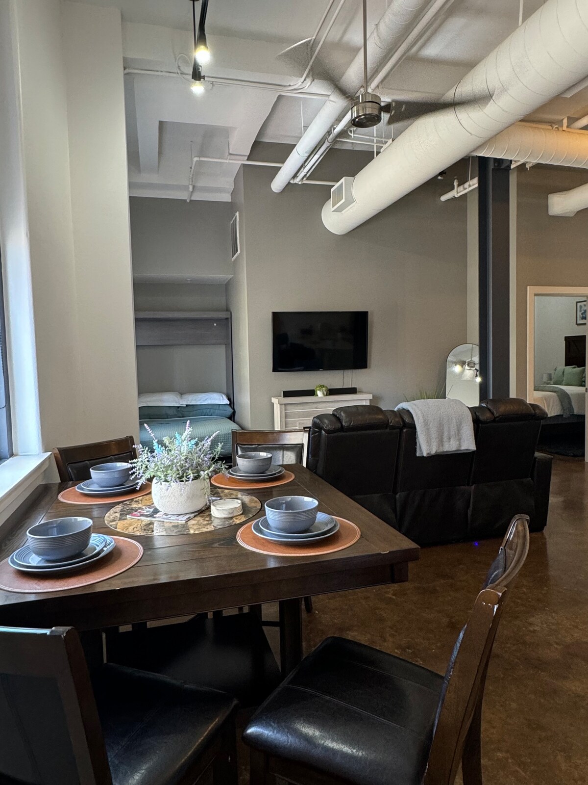 Welcome to our industrial-style one-bedroom in Sundance Square, set in a historic 1936 building. Enjoy high 20ft ceilings, tall windows, and a pull-down Murphy bed. Just blocks from the Convention Center and walking distance to coffee shops, restaurants, piano bars, dance clubs, and speakeasies. Explore nearby Fort Worth landmarks like the Arts District, Stockyards, 7th Street, and Dickies Arena, all just a few miles away. Perfect for groups seeking easy access to everything the city offers!