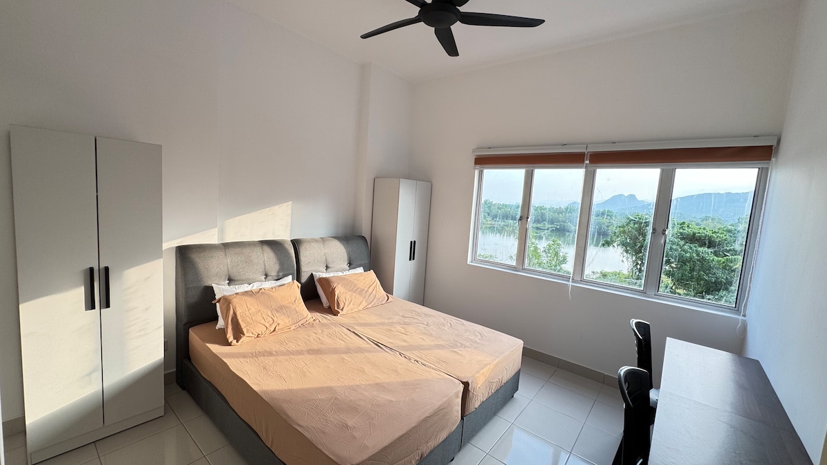 High-floor corner unit with 2 balconies where you can enjoy scenic mountain and lake views. The space is fitted with a King-sized bed. - Air conditioning - Ceiling fan - Water dispenser - Water heater - Hairdryer - Washer - Towels - Refrigerator - Microwave - Plates, bowls & cutlery ■ 5 mins driving distance to UTAR ■ 24 hrs security ■ Free indoor parking slot ■ 99 speed mart nearby