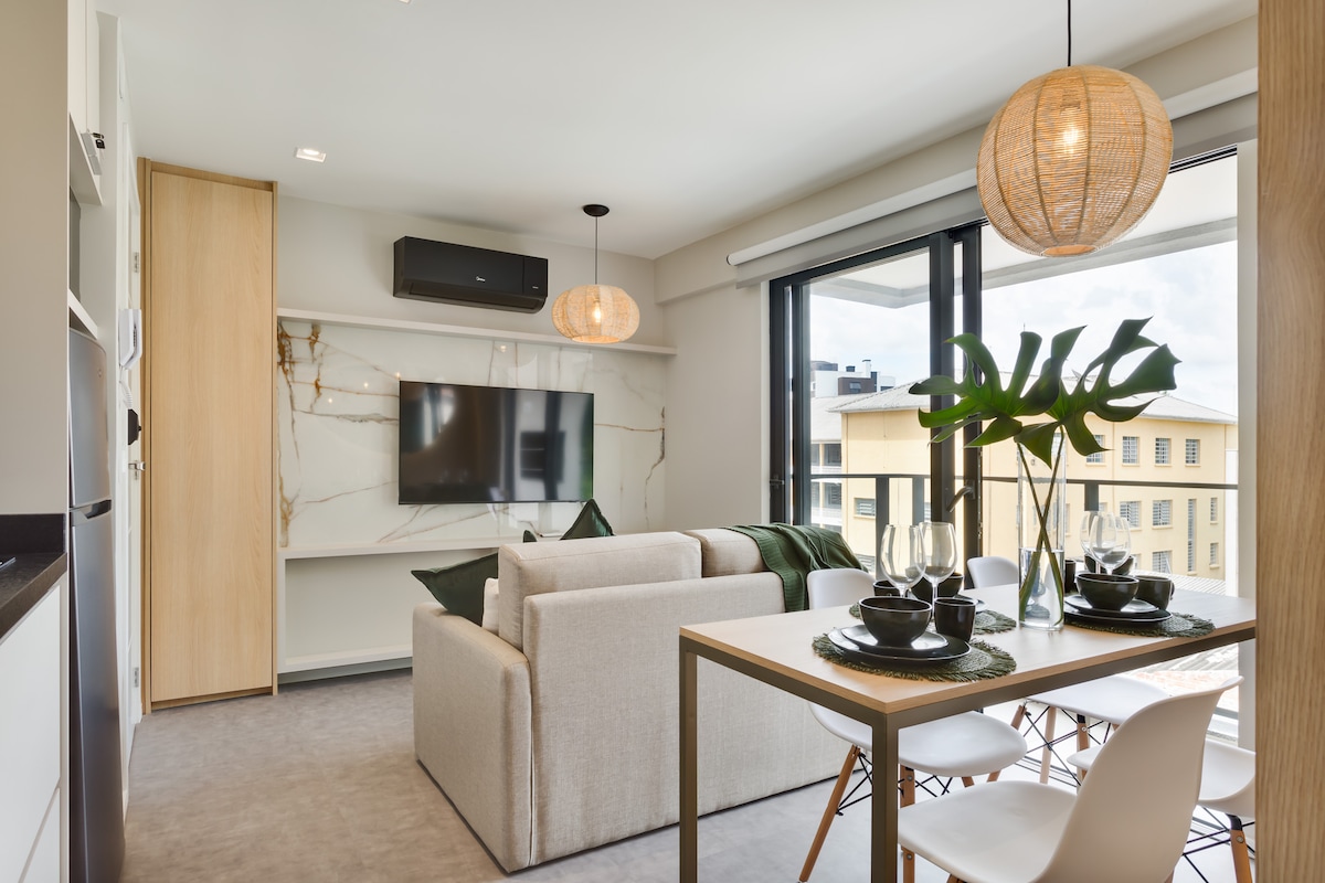 Studio Premium no luxuoso Diamond Tower, Batel. Acomoda até 2 pessoas com cama de hotel, ar-condicionado, cozinha equipada e enxoval 5 estrelas e uma sacada deliciosa. 🚗O imóvel possui garagem com serviço de valet, incluso na estadia como cortesia. É necessário deixar a chave do veículo com os manobristas. Prédio incrível com coworking, rooftop com vista deslumbrante e lavanderia. Atendimento Urooms 24h. Viva Curitiba com conforto e estilo!