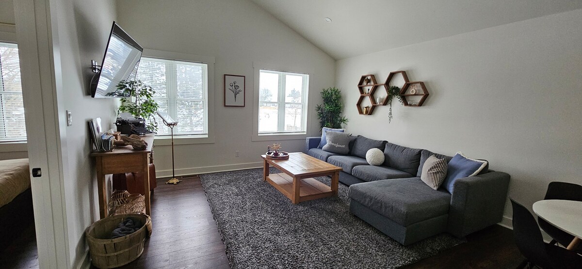 Beautifully situated in the heart of Niagara's wine country and minutes away from the Bruce trail and other hiking favourites, our guest house boasts peaceful views of rolling farmland. Built on top of a barn-style workshop, this private and peaceful studio space is the perfect Niagara getaway for a couple or an individual. Come catch a stunning sunset on your own private deck while you sip a glass of wine or enjoy a coffee. Other perks for your enjoyment: king size bed and out door firepit.