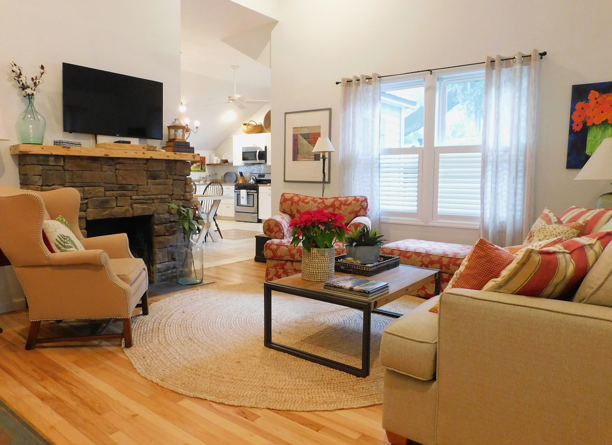 We love the laidback neighborhood, charming historic architecture, and the 5-block walk to the breezy waterfront along Bay Street. The cozy cottage is one bedroom, one bath, and a lovely living space on a postage stamp lot. The built-in breakfast nook is our favorite spot. Other features are the chic furnishings, 11’ ceilings, tall casement windows, and little front porch. Off-street private parking for one car and smart tv/wifi. The 400 SF cottage is named after the architect's daughter.