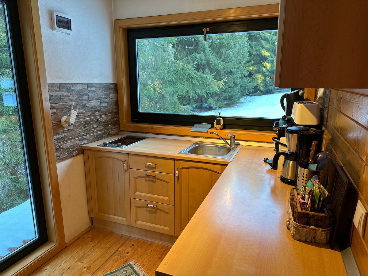 自然の中にあるこのロチロと居心地の良いインテリアのロマンチックな宿泊先をお楽しみください。このタイニーハウスには、オープンプランのリビングスペース、キッチン、バスルーム、中二階のベッドルーム、湖を望む屋外テラスなど、必要なものがすべて揃っています。 湖やハイキングコース、マウンテンバイク、ベリス湖でのパドルボードなど、夏の休暇に最適です。また、マリセルスカイとスノーボードスロープへの冬の旅行にも最適で、わずか20 kmで行けます。