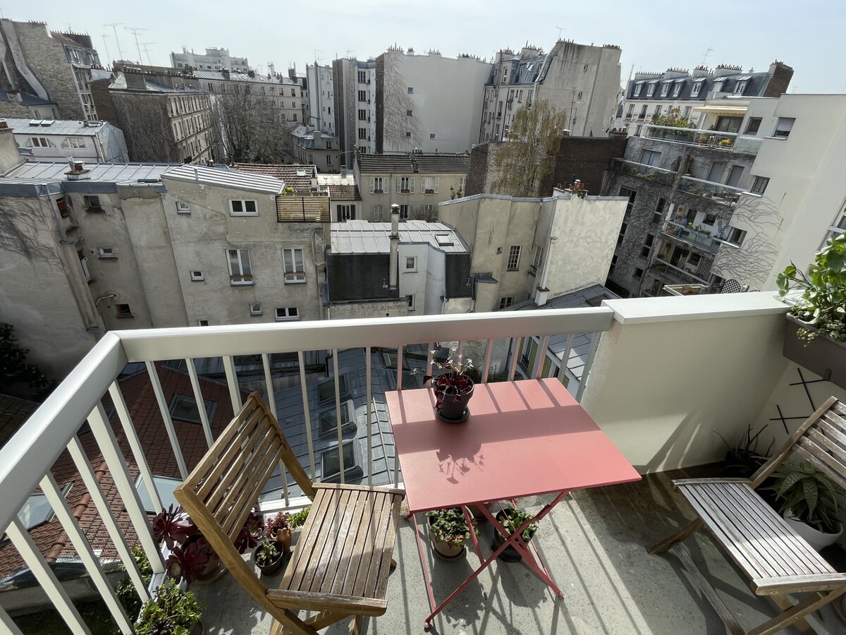 私の典型的なパリ風の明るく、エアコン完備のアパートは、エレベーター付きの魅力的なアパートの最上階にあります。賑やかな地元の人々が集う、多くのカフェ、バー、レストランがあるおしゃれなマルティル通りエリアにあります。モンマルトル、ムーラン・ルージュ、オペラ、3つの地下鉄線( 2、7、12 )まで徒歩ですぐです。 リビングのバルコニーからはパリの屋根とエッフェル塔の素晴らしい景色が見えます。設備の整ったキッチンと高速Wi-Fi。