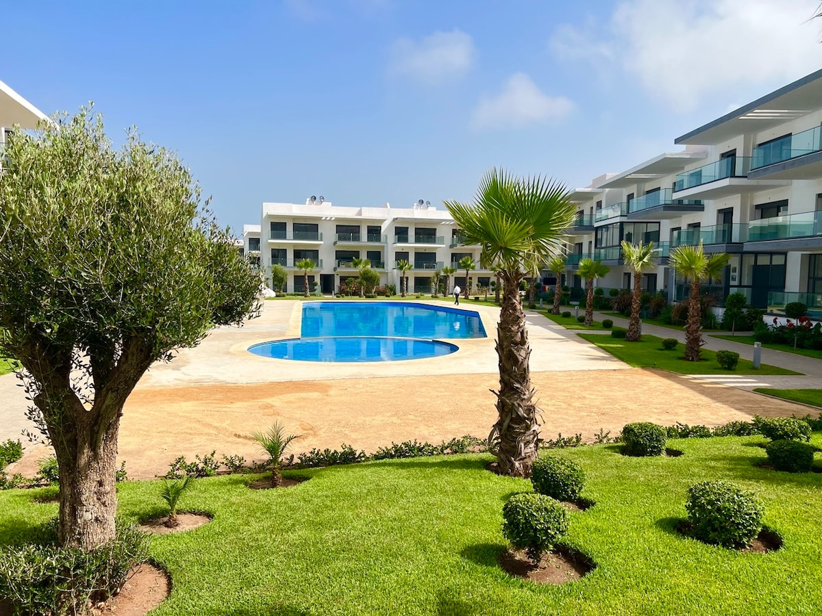 🏡居心地の良い120㎡のアパート📍ダル・ブアザ、カサブランカから20分、ビーチから1 km 🌊 🛏️テレビ付きの寝室2室(Netflix/Prime) 🛁 2つのバスルーム 🛋️ 現代的なモロッコの広いリビングルーム 🌅テレビ、ソファ、プールの景色を楽しめるテラス🏊♂️ 🌴 プール、ヤシの木、オリーブの木が植えられた安全な住居 🌳 ✨家族やカップルでのんびり過ごすのに最適💑 🛍️海とアメニティに近い!