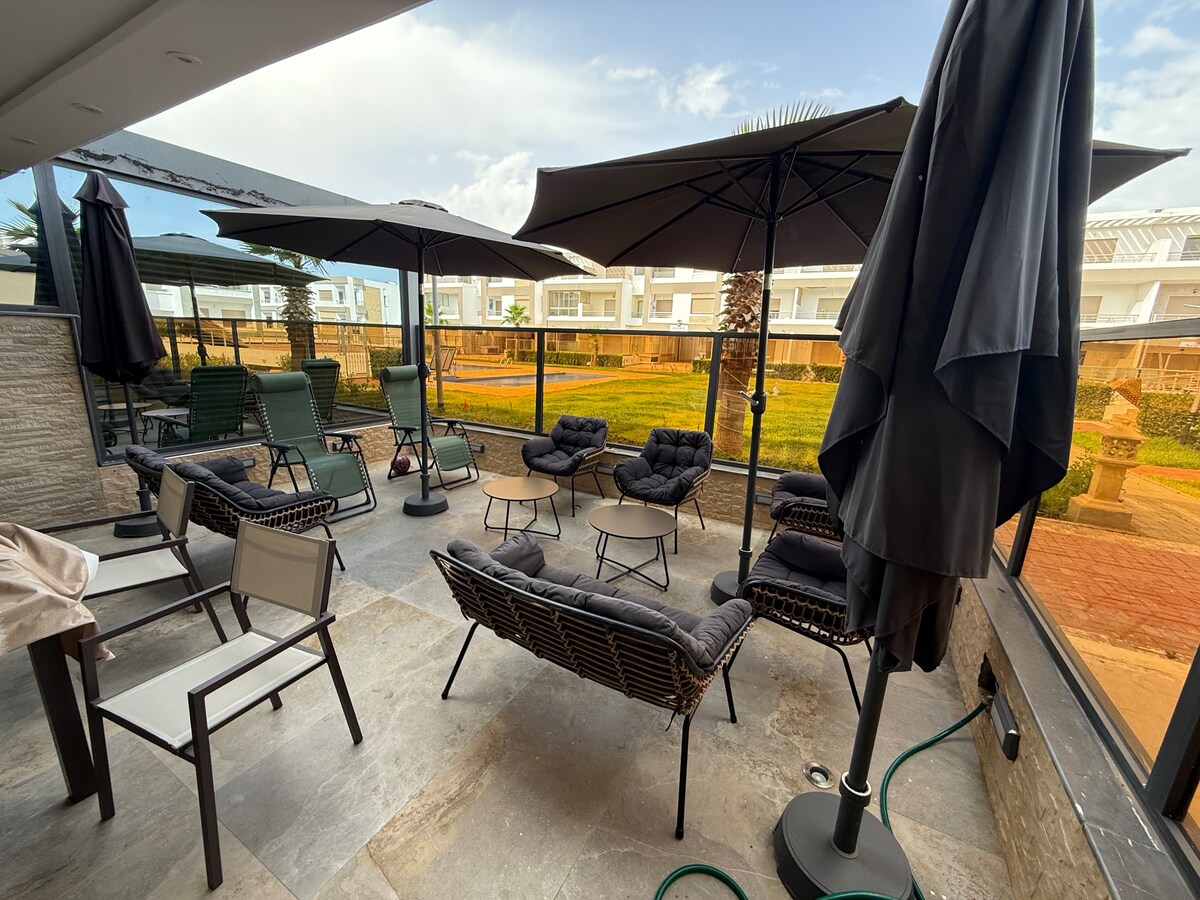 Résidence les Jardins de Bouznikaは市内中心部とブズニカビーチの間に位置しています。 安全な住居、 プールエリア、バルコニー、専用テラスに直接アクセスできる1階のアパート、2ベッドルーム、設備の整ったアメリカンキッチンを備えたリビングルーム。 🚘 無料 ADSL✅️ Wi - Fi駐車場高速