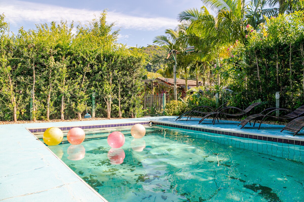 3つのスイート(クイーンベッド2台とダブルベッド1台)、フルキッチン、55インチテレビ付きのリビングルームを備えた広々としたコテージ。エアコンとバルコニー付きの客室。中心部から20分、自然に囲まれた静かな場所です。敷地内のプライベートな滝の音を聞きながらリラックスしてください。滝で入浴することもできます。プール、バーベキューグリル付きデッキ、そして菜園をご利用いただけます。2台分の屋根付きガレージと、さらに多くの車を駐車できる大きな中庭。ビーチからは約1時間半。家族連れに最適です。