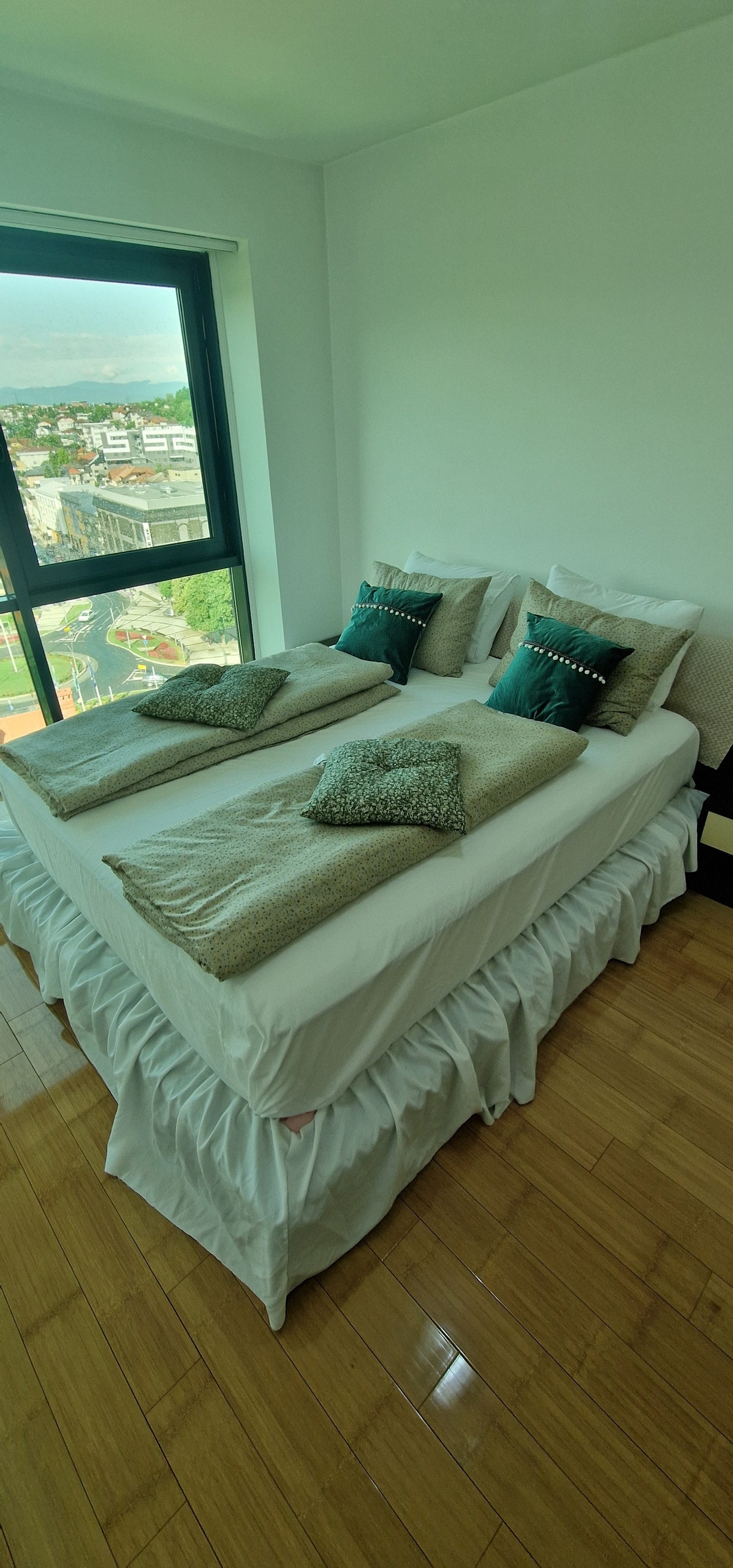 Moderno, novo tri sobno stanovanje (85m2). Garaza + parking pred stavbo. Stanovanje je na 7. nadstropju z dvigalom. Balkon ima lep pogled cez mesto. Stanovanje je v celoti opremljeno z klimatsko naprava, kopalnico z tuṣ̌em, kuhinjo, dve ločeni spalnici z zakonskima posteljema in dnevna soba z dvema sedežnama. Na voljo sta tudi sušilni in pralni stroj.