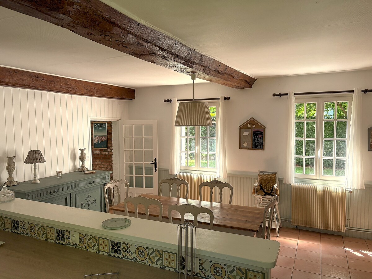 果樹のある大きな果樹園の中にある、海辺から15分のところにある、典型的なノルマンディーの家です。リビングには大きな暖炉があり、大きな庭はバーベキューに最適です。古き良き魅力とモダンな設備がすべて揃った、平和な隠れ家。すべての商品が揃ったバス停のある村から車で5分。 週単位でのみ貸し出し(ハイシーズンは土曜日から土曜日まで)(6月中旬から8月末まで)