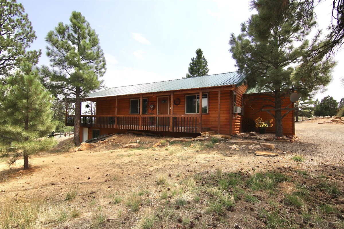 Cabin is set in the towering Ponderosa Pines, located 2.7 miles off Highway 191. 2 story cabin features wrap around porch: main floor, kitchen, dining room, couch, love seat, bathroom and (1 Queen)Bed room, stairs (14) lead to upstairs loft, TV, pool table, bathroom, 1 (2 Queen beds) bedroom, roomy loft and lots of windows to let in sun. Most photos taken in early snowy morning in March 2017 Porch great for sitting, enjoying the wildlife! TV is there to use w/ your streaming services, no cable