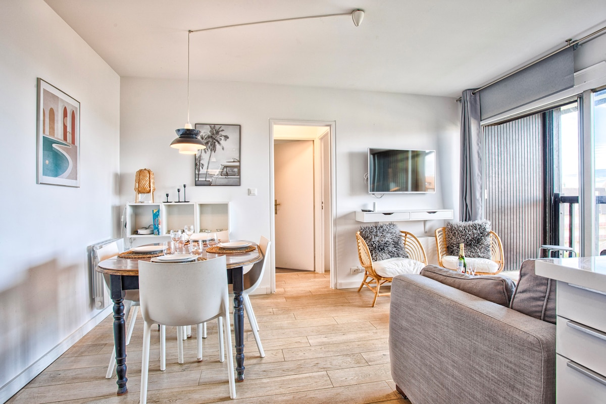 この美しく静かで明るいアパートで、海辺でのんびりした滞在をお楽しみください。 設備の整ったキッチンにつながる広いリビングルーム、キングサイズのダブルベッドを備えた寝室、海の眺めをお楽しみいただけます。 光に包まれたリビングルームには、2人用の大きなソファベッドがあります。 エレベーター付きの3階にあります。 海まで徒歩8分、ドーヴィルの中心部から4km、トルヴィルの中心部から5km。 レジデンスの前には無料駐車場があります。